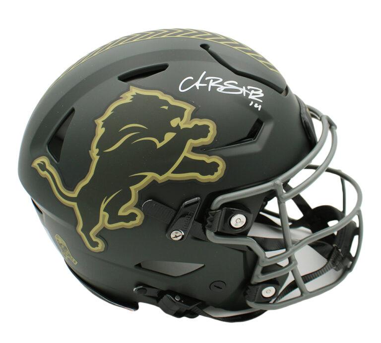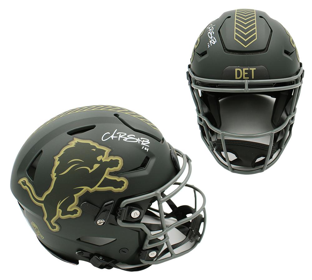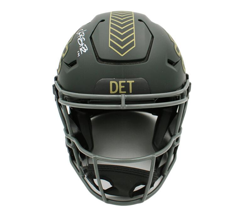 Riddell Detroit Lions full-size authentic on-field salute to service alternate speedflex helmet has been hand-signed by Amon-Ra St. Brown.