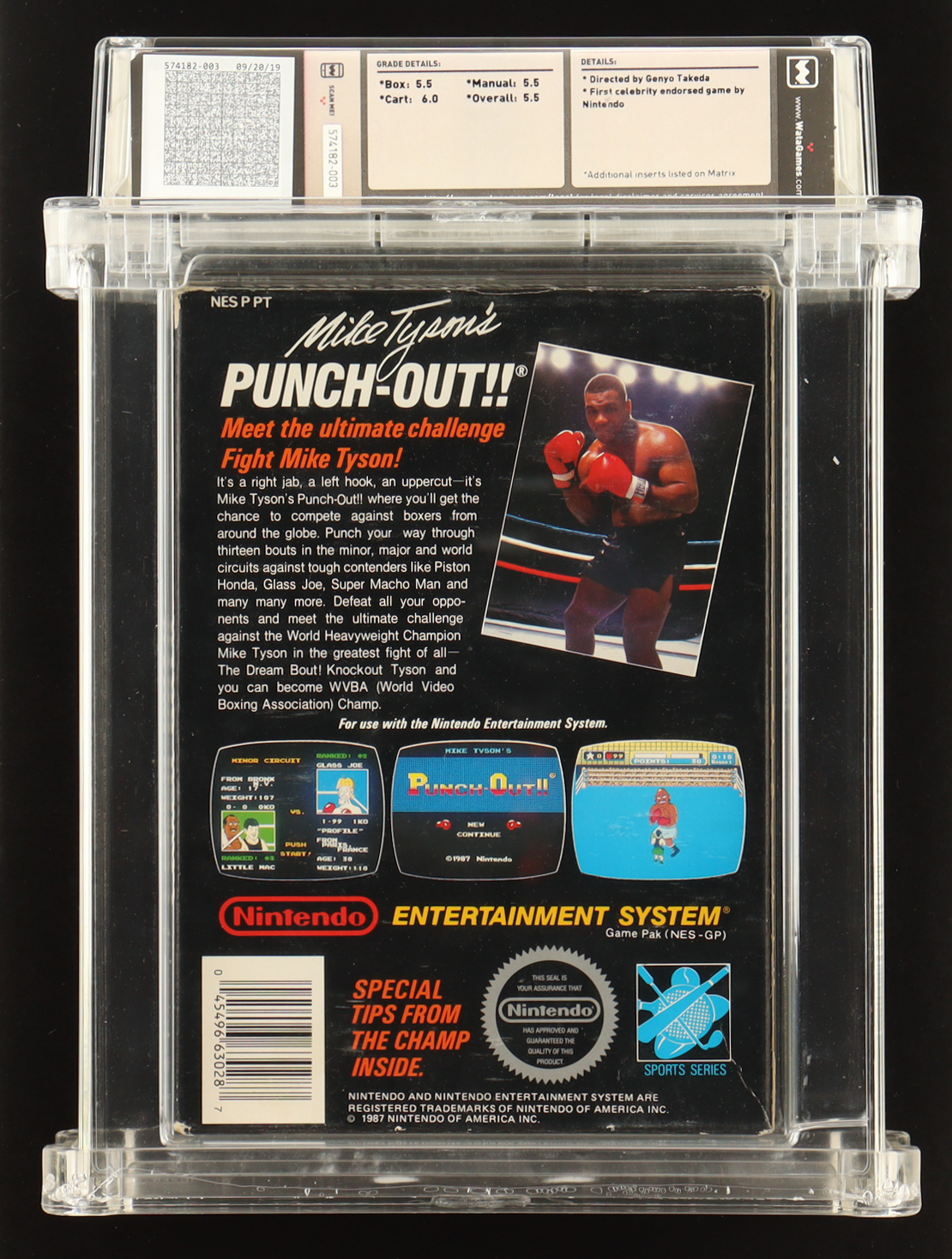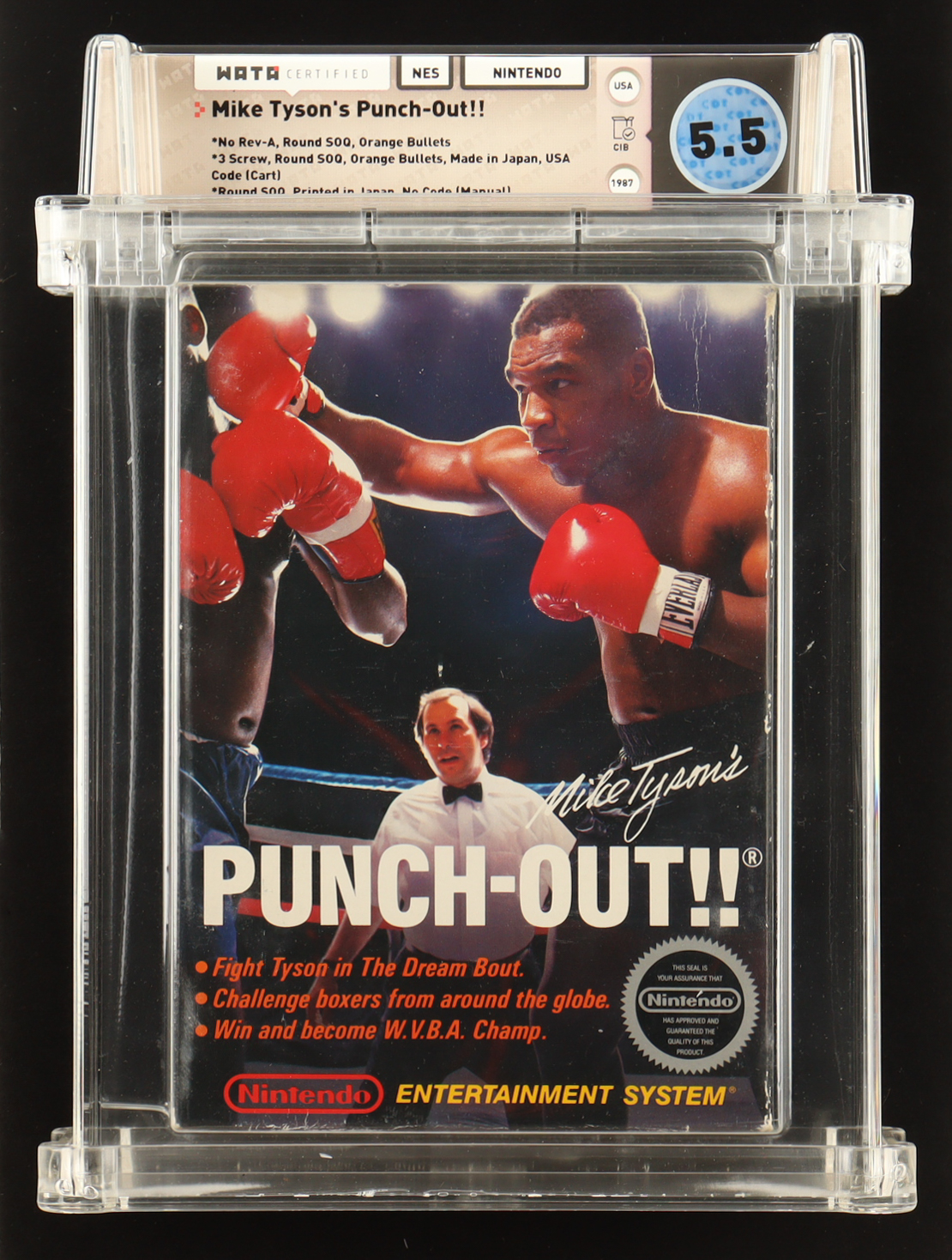 1987 "Mike Tyson's Punch-Out!!" NES Video Game graded WATA 5.5. Please note, the Nintendo game is unsigned. Please see photos for details regarding the condition of the Nintendo game.