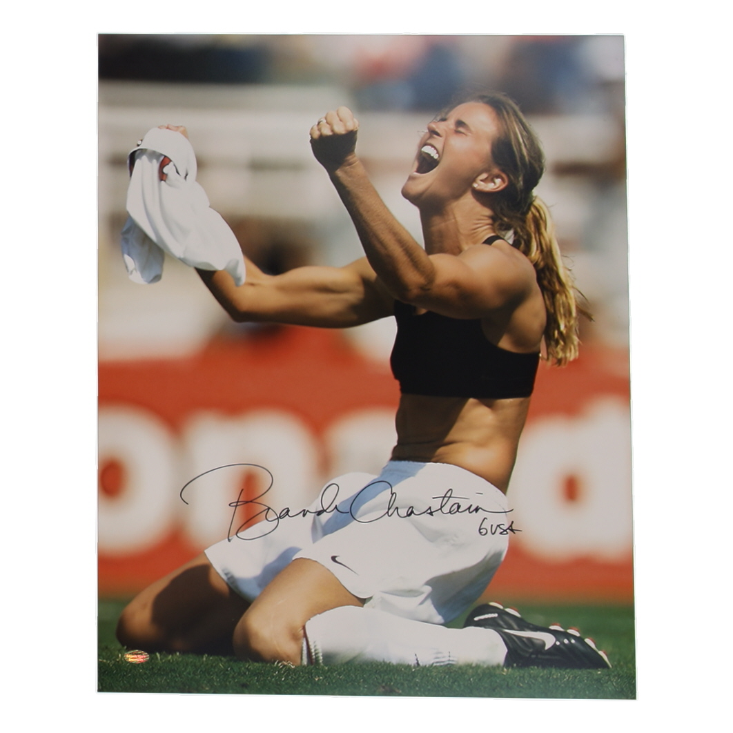 Photo measures 16" x 20" in size. Hand-signed and inscribed by Brandi Chastain (HOF).