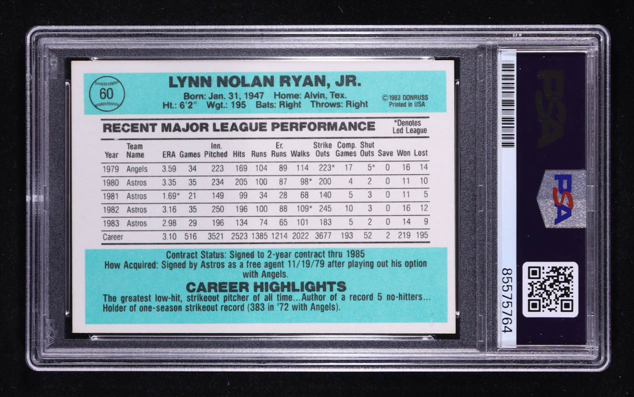 Nolan Ryan Signed 1984 Donruss Inscribed "108.5 MPH Fastball" #60 (PSA | Autograph Graded PSA 10)