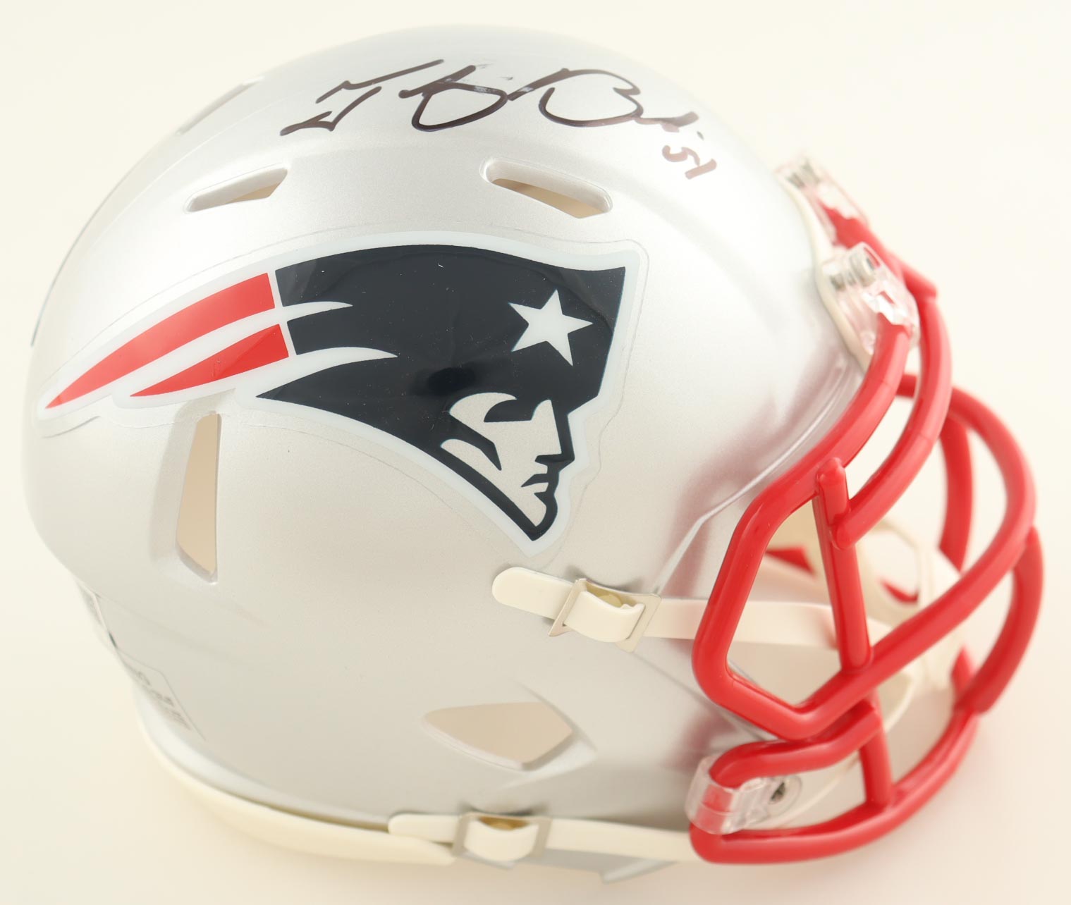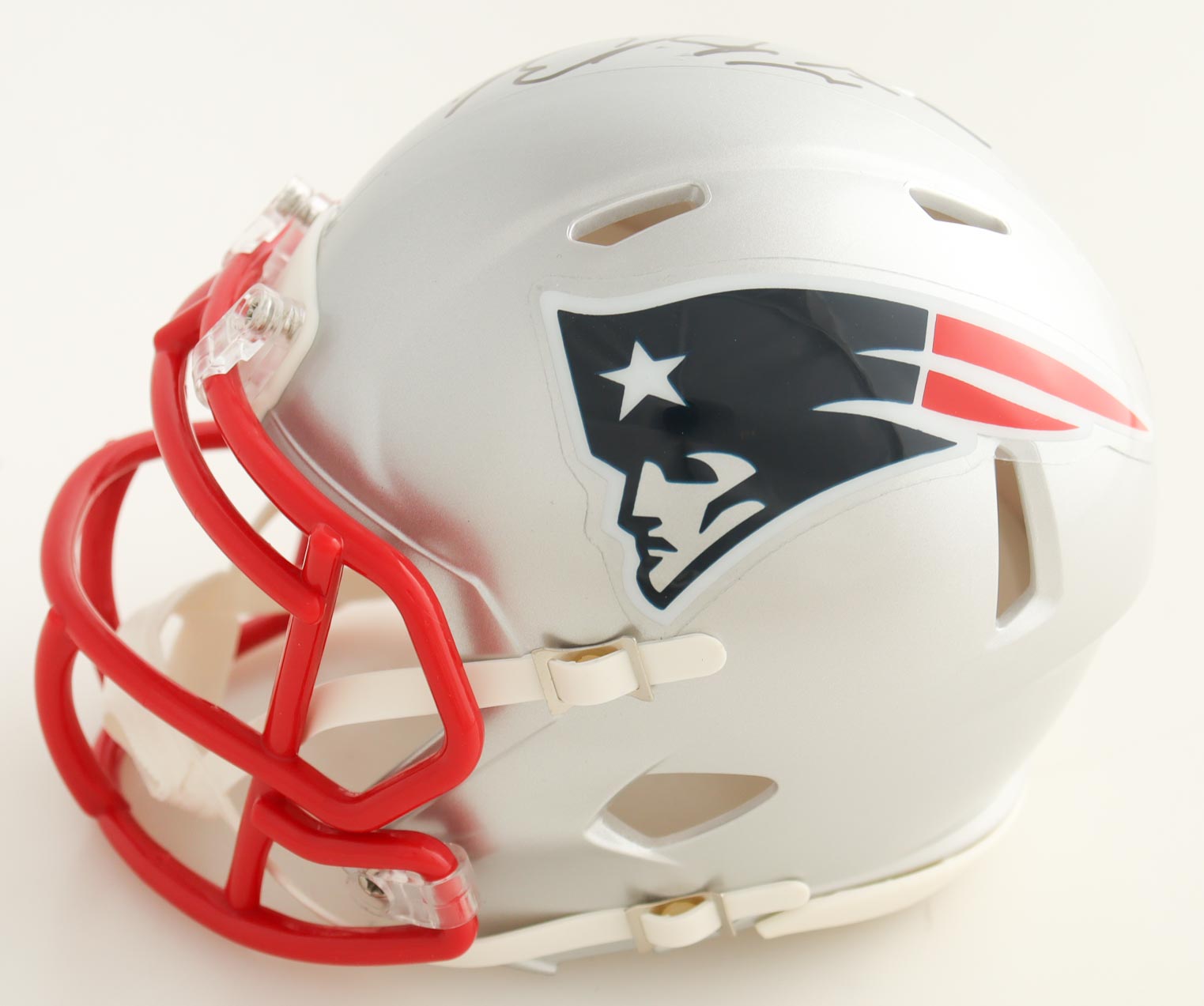 Riddell New England Patriots speed mini helmet. Hand-signed by Tedy Bruschi.