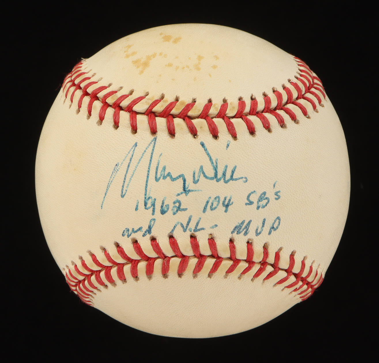 Rawlings Official National League Baseball. Hand-signed and inscribed by Maury Wills (D. 2022, Los Angeles Dodgers). Please note, the baseball is naturally toned and stained.
