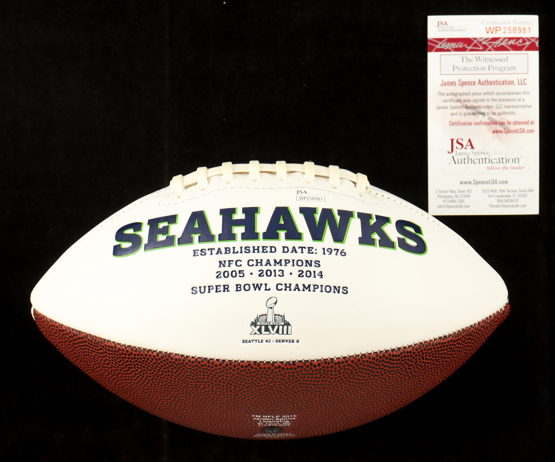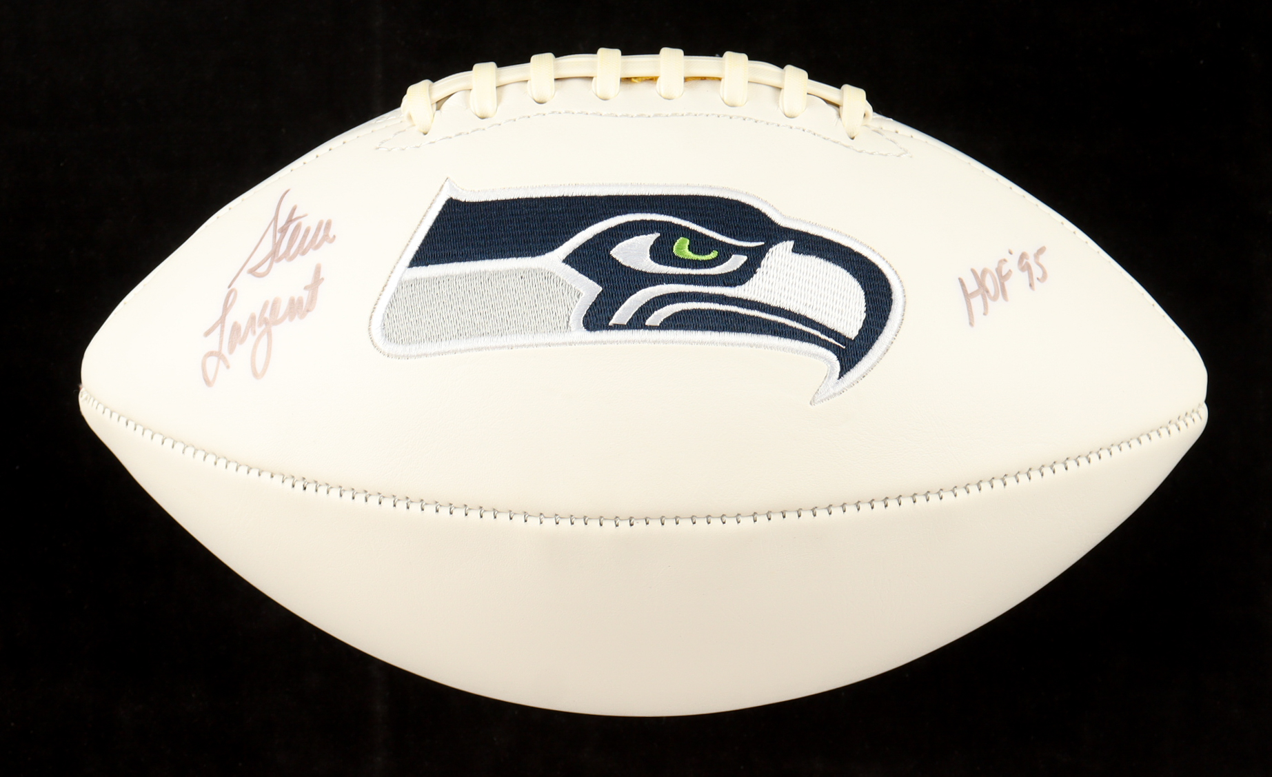 Seattle Seahawks Logo Football. Hand-signed and inscribed by Steve Largent (HOF). Please note, the signature has bled, there are stains throughout the football and it does not fully hold air.