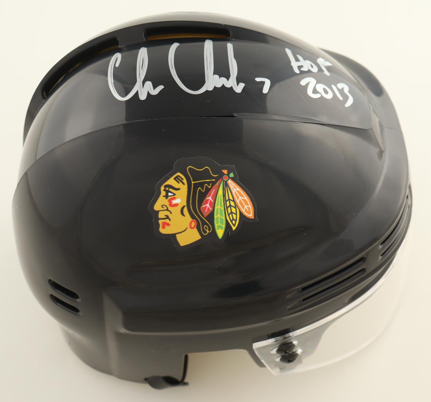 Chicago Blackhawks mini helmet has been hand-signed and inscribed by Chris Chelios (HOF).