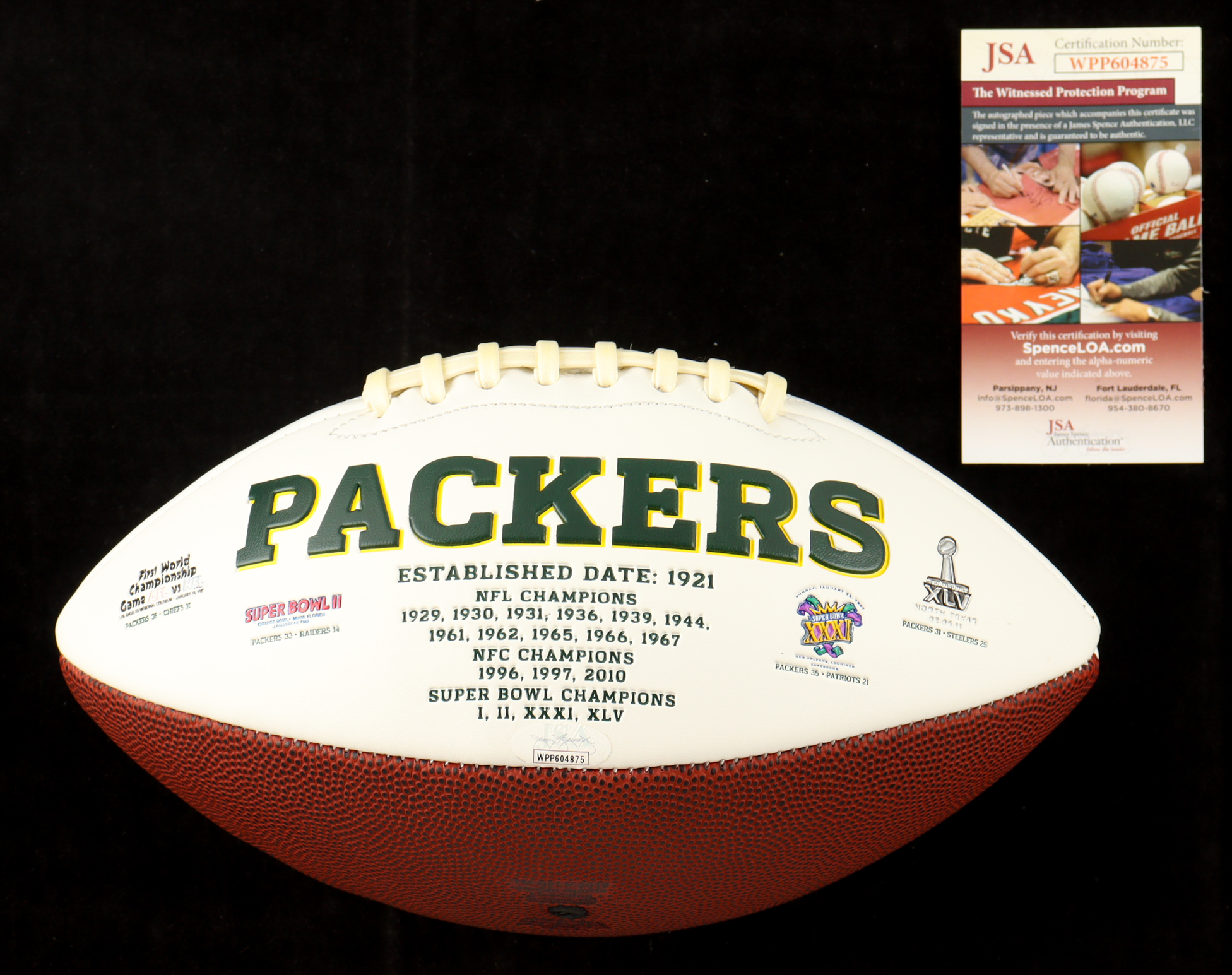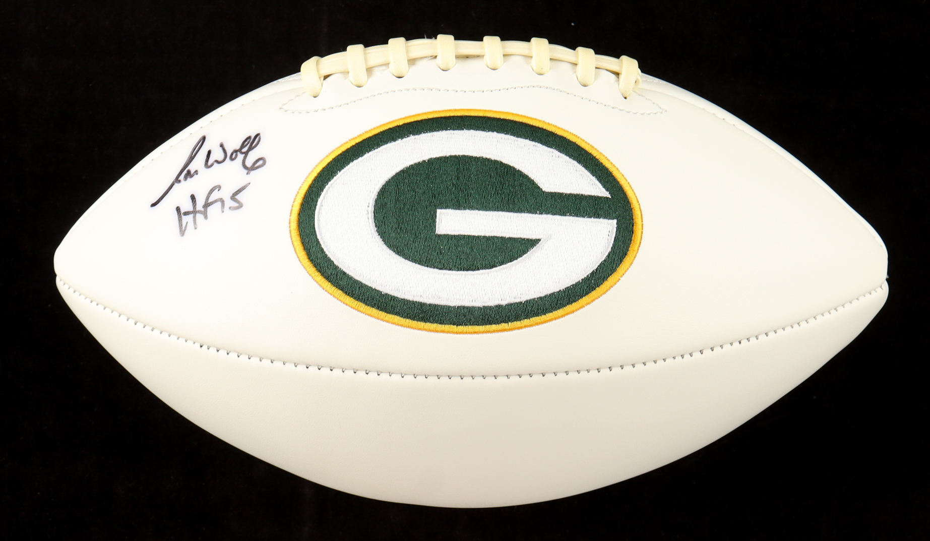 Green Bay Packers Logo Football. Hand-signed and inscribed by Ron Wolf (General Manager, HOF). Please note, the signature has bled and there are stains throughout the football.