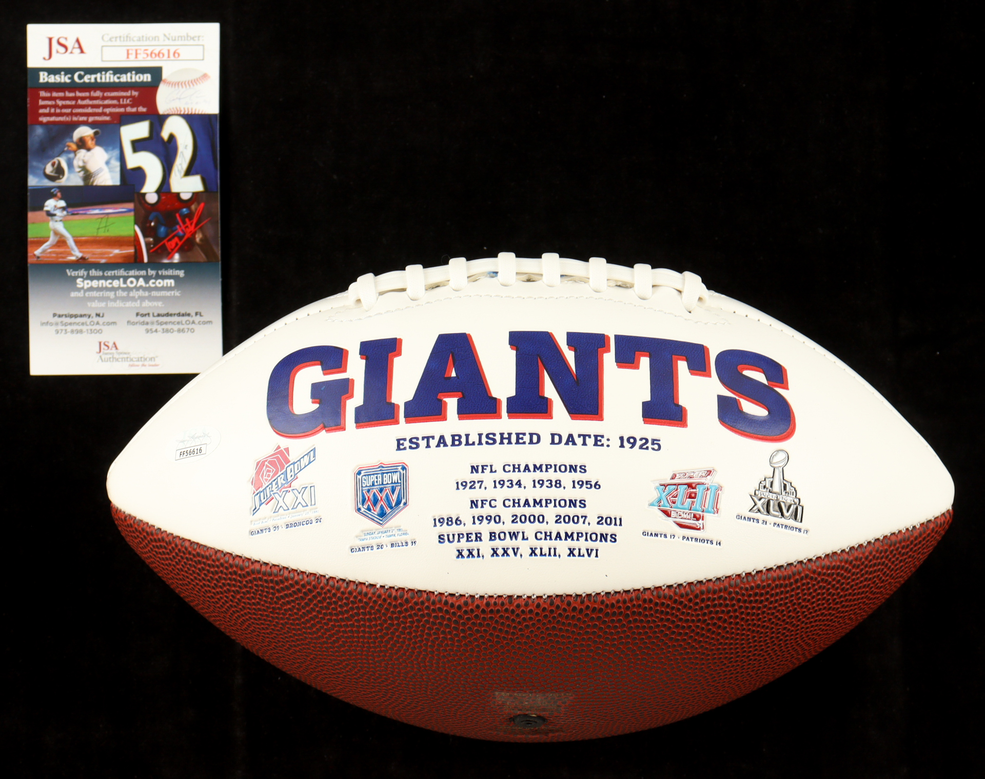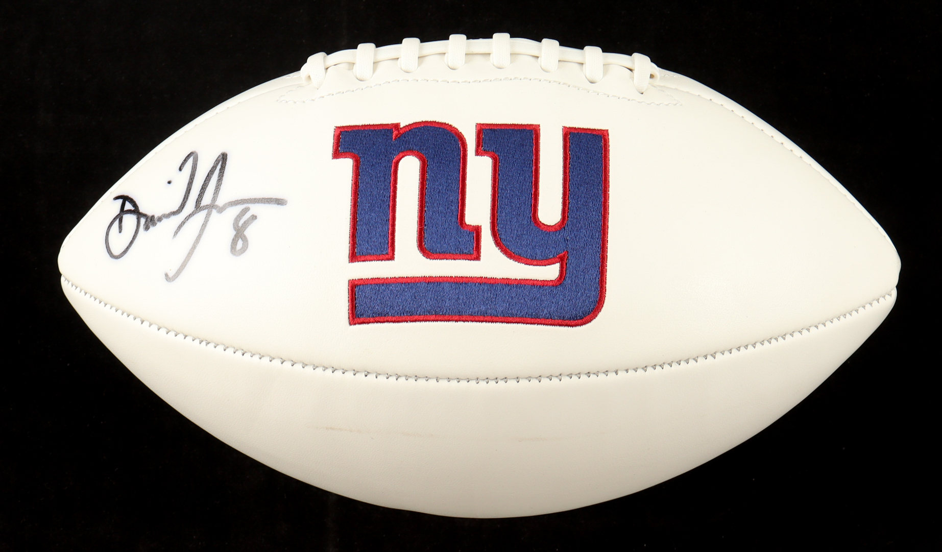 New York Giants Logo Football. Hand-signed by Daniel Jones. Please note, the signature has bled and there are stains throughout the football.
