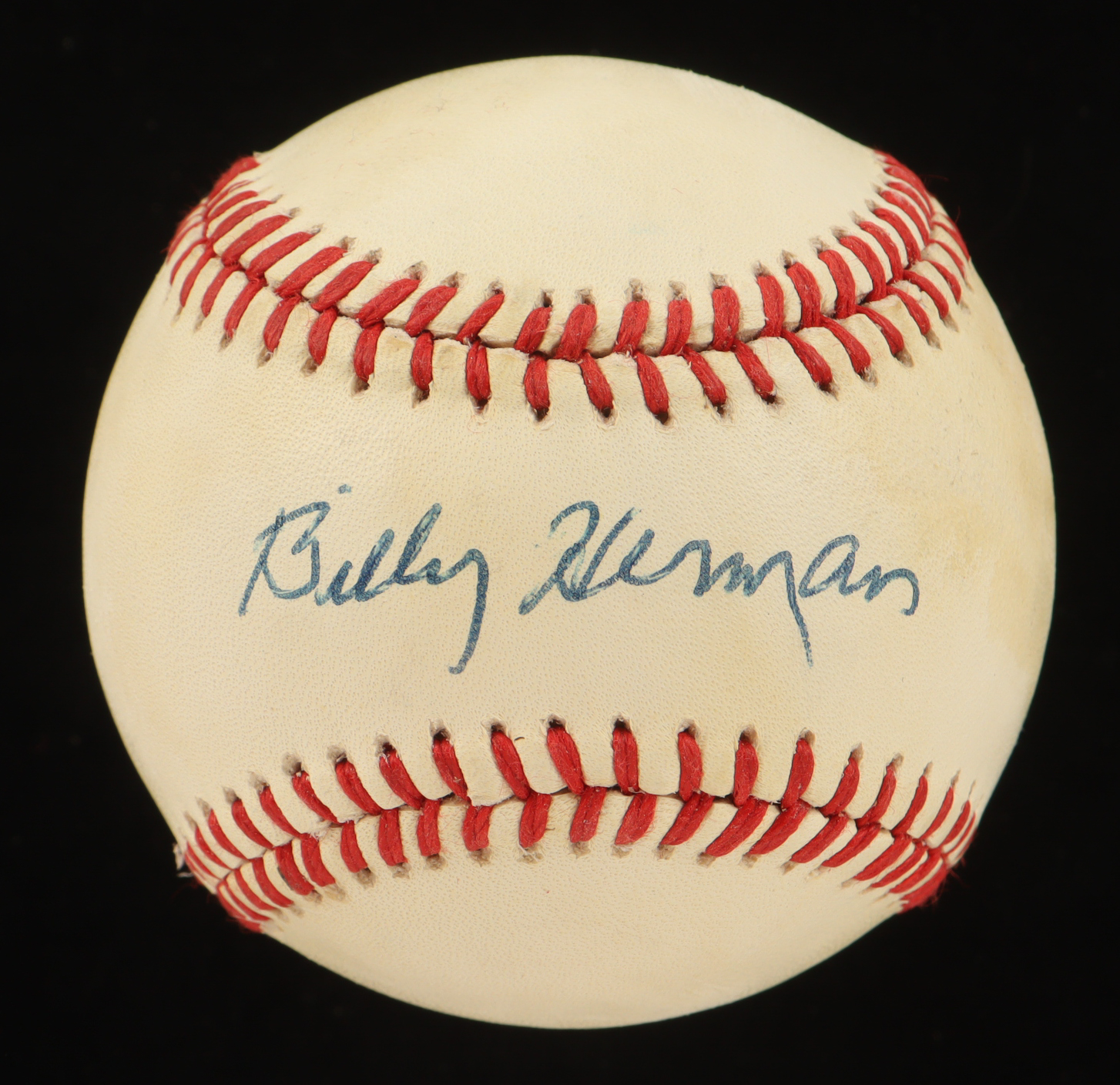 Rawlings Official National League Baseball. Hand-signed by Billy Herman (D. 1992, Chicago Cubs, HOF). Please note, the baseball is naturally toned and stained.