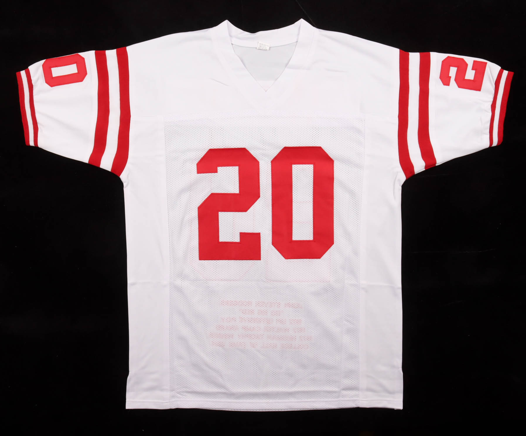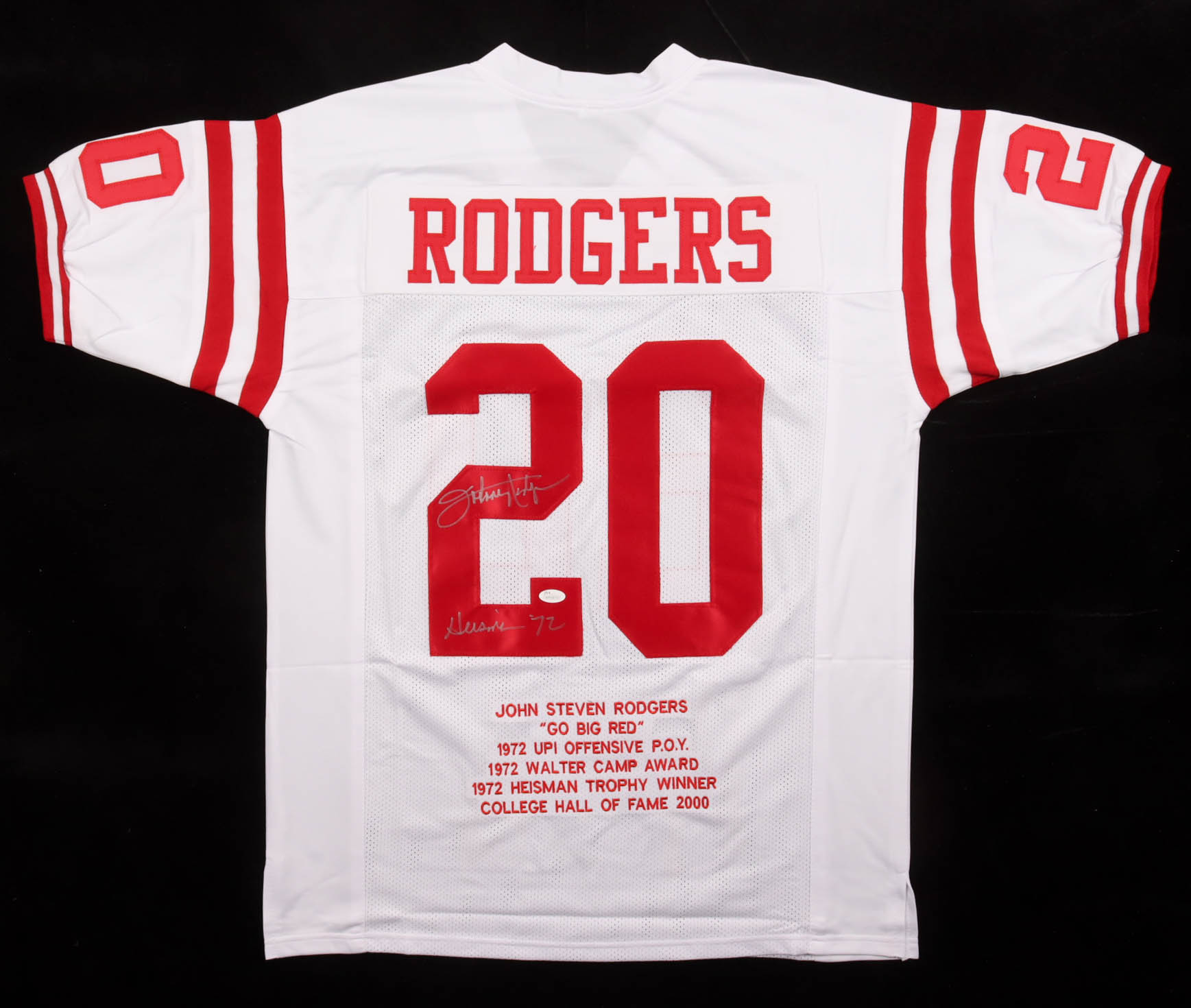 Custom jersey with everything sewn on, size XL. Hand-signed by Johnny Rodgers. Rodgers' career highlights have been custom stitched onto the back of the jersey below the reverse numbers.