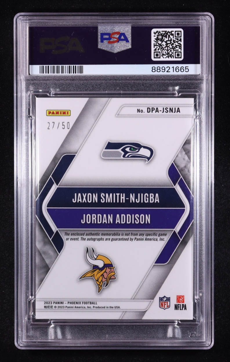 Jaxon Smith-Njigba / Jordan Addison 2023 Panini Phoenix Dual Patch Autographs #13 #27/50 RC (PSA 9)