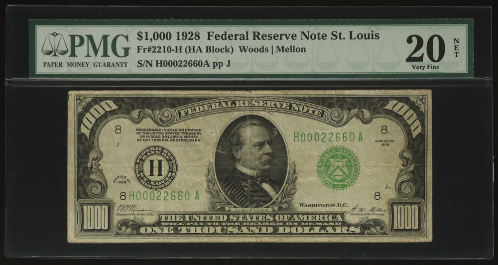 1928 United States $1000 Thousand Dollar Federal Reserve St. Louis Banknote (PMG 20 VF)