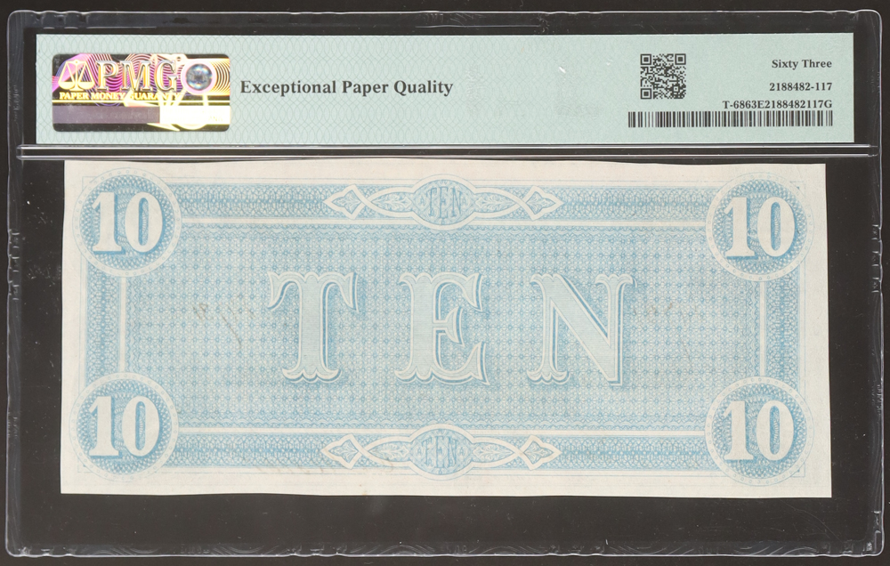 1864 Confederate States of America $10 Currency Note T-68 (PMG 63 Choice Uncirculated EPQ)