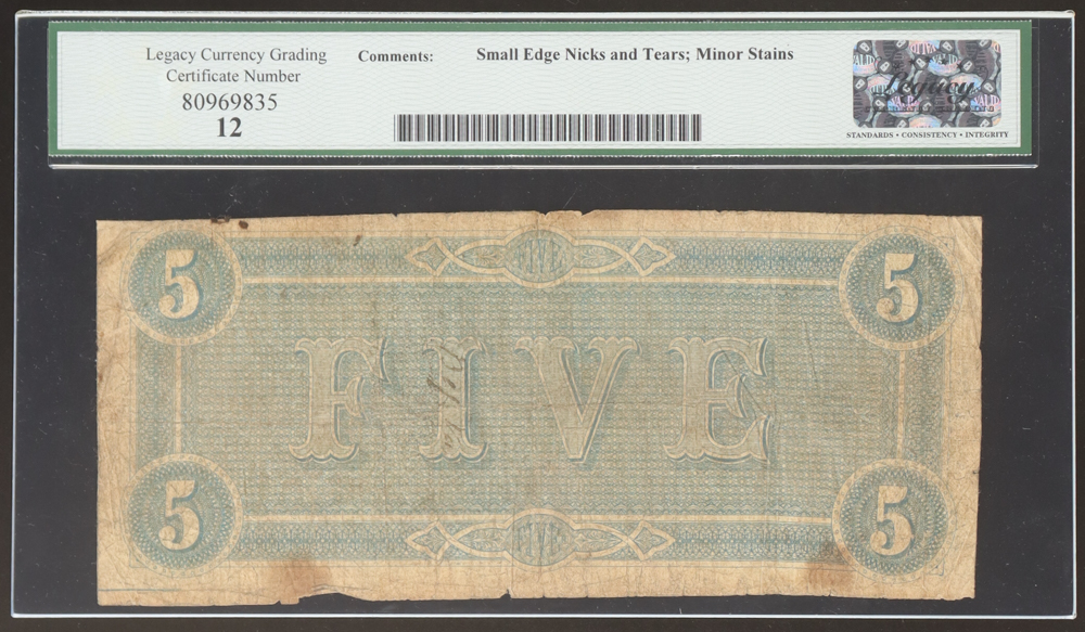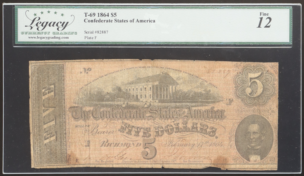 1864 Confederate $5 Currency Note, T-69 (Legacy 12 F)