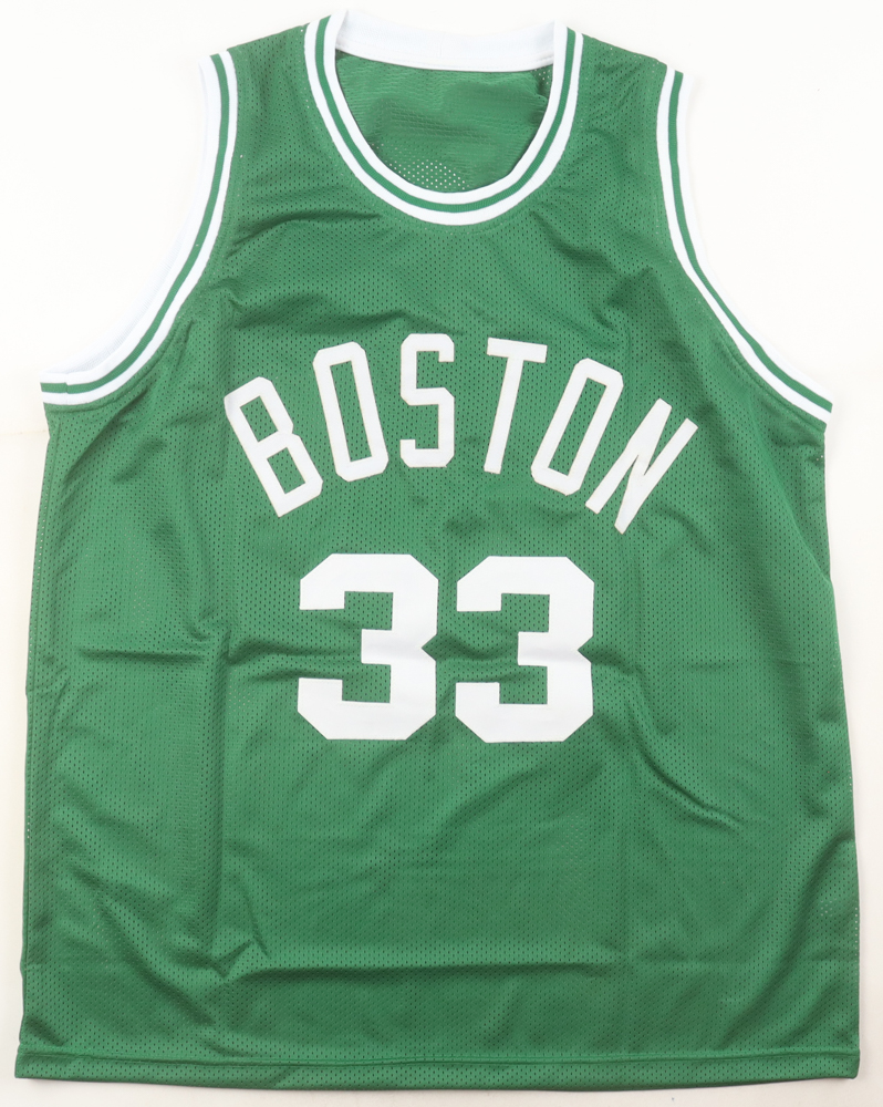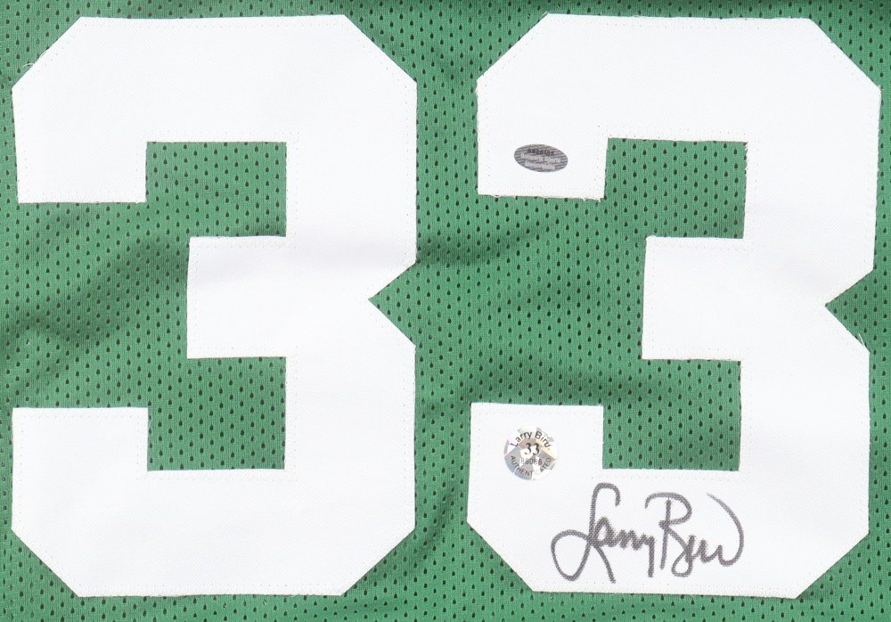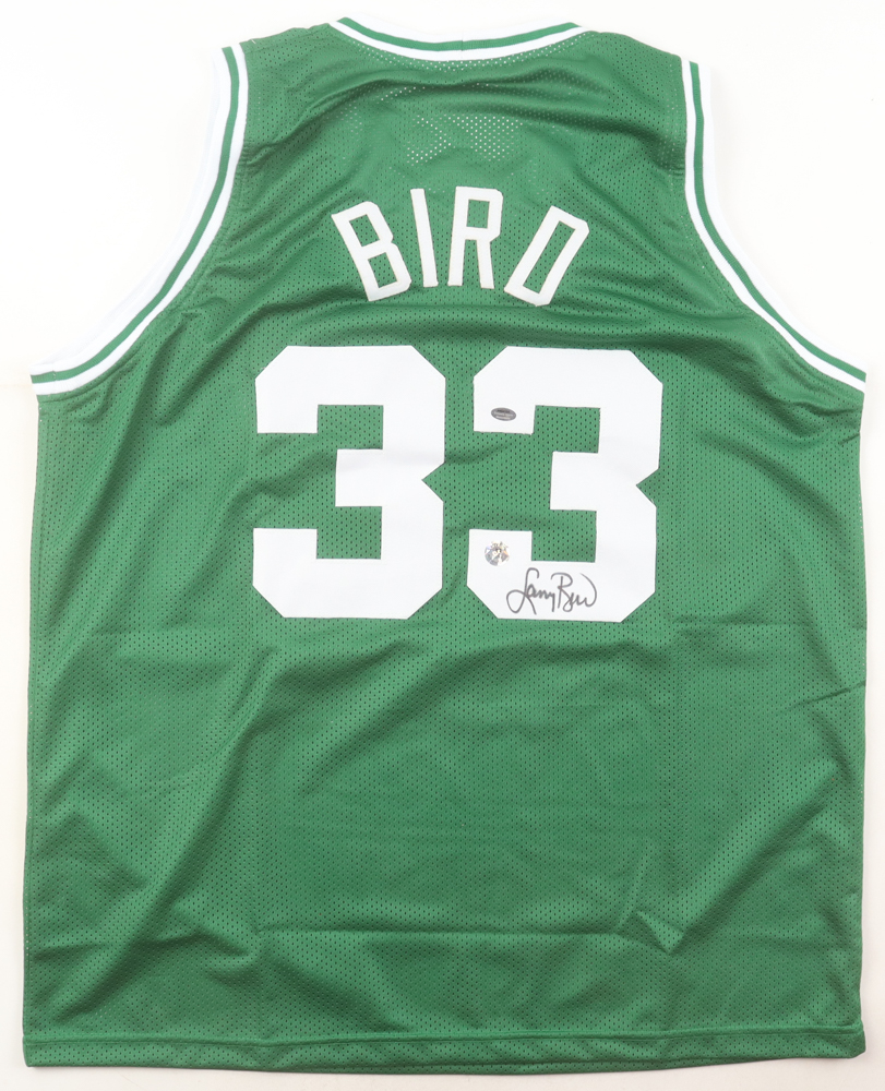 Custom jersey with everything sewn on, size XL. Hand-signed by Larry Bird (HOF).