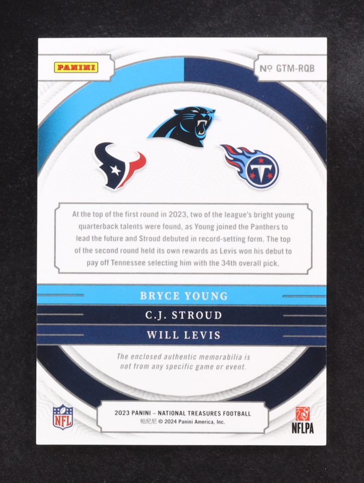 Bryce Young / CJ Stroud / Will Levis 2023 Panini National Treasures NFL Gear Trio Materials #1 #42/99 RC