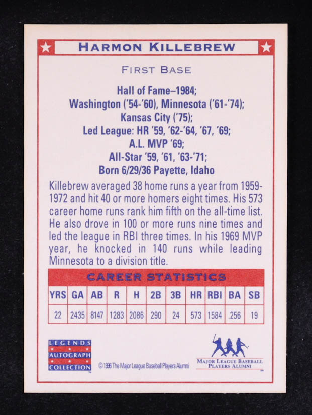 Harmon Killebrew 1996 Major League Players Alumni Legends Autograph Collection #NNO