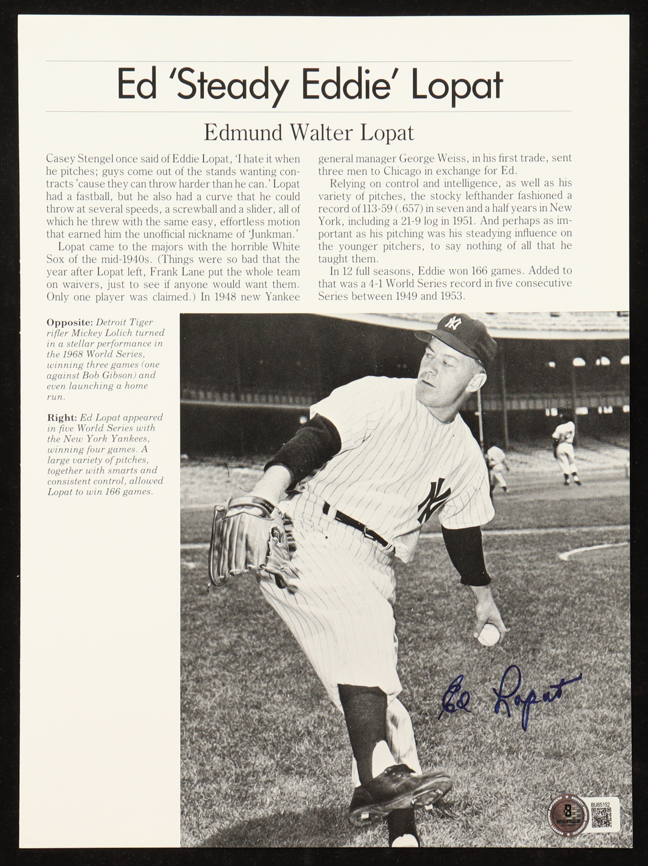 News cutout measures 9 x 12" and has been hand-signed by Ed Lopat (New York Yankees).