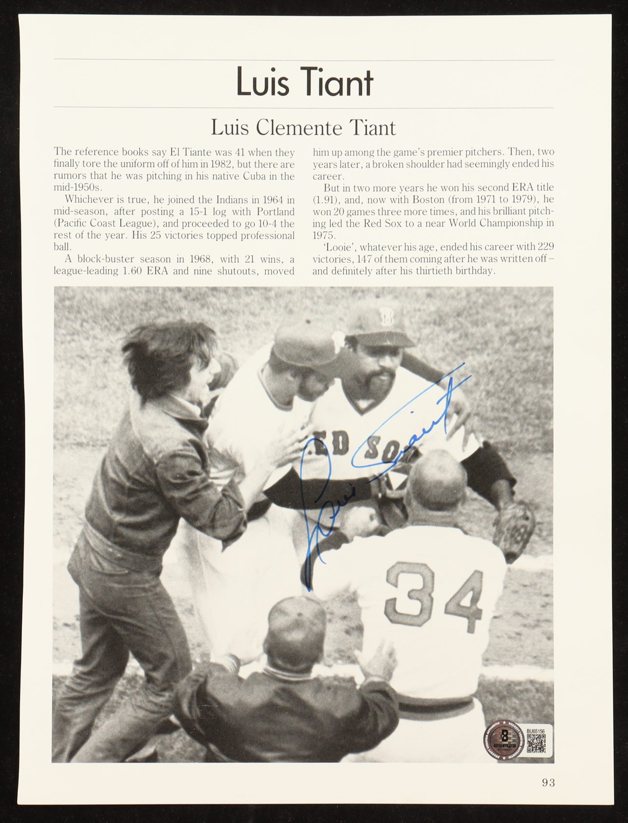 News cutout measures 9 x 12" and has been hand-signed by Luis Tiant (Boston Red Sox).