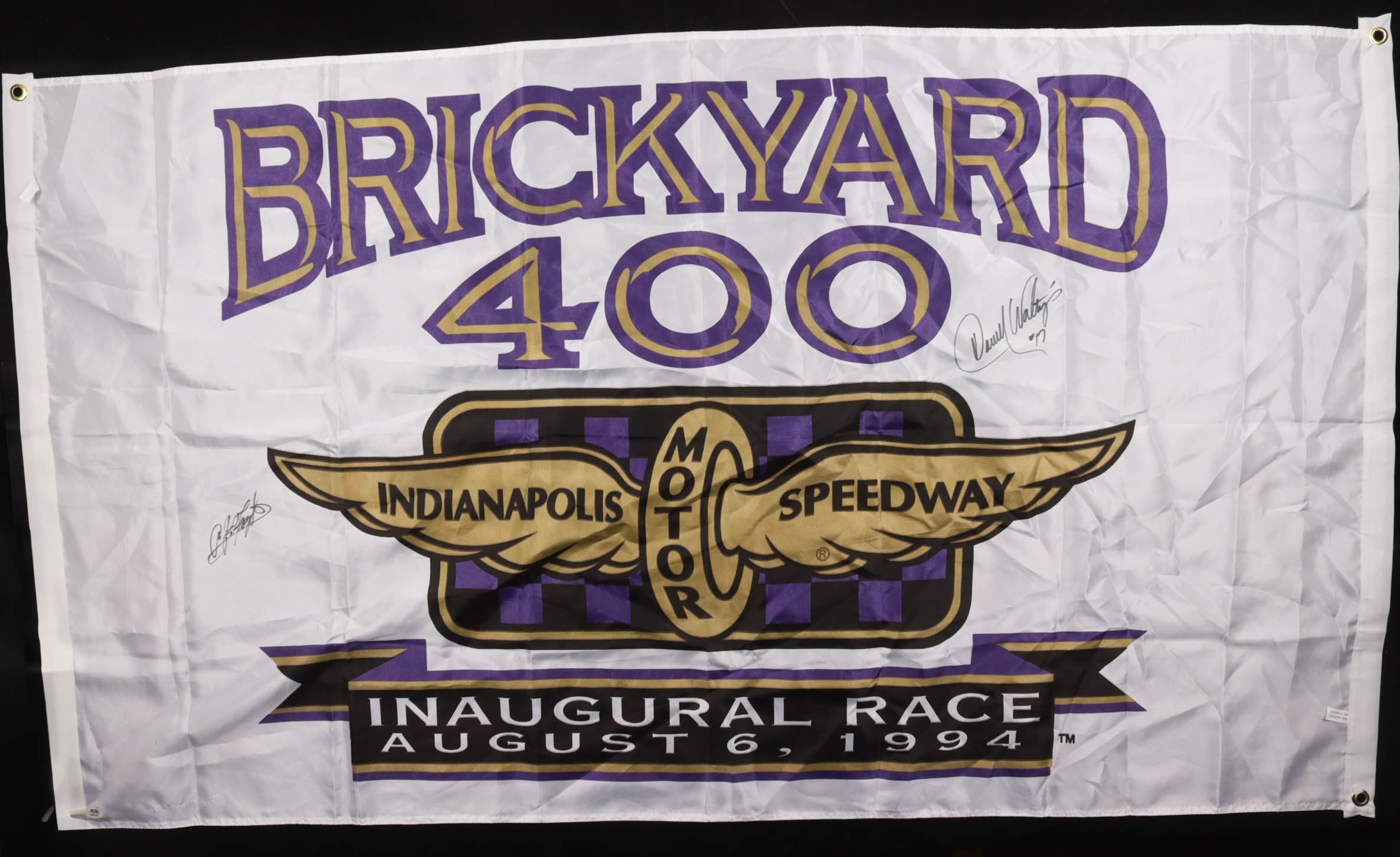 Brickyard 400 Inaugural Race Banner measures approximately 35.5" x 61.5" in size and has been hand-signed by Darrell Waltrip & A. J. Foyt. Please note, the signatures have bled.