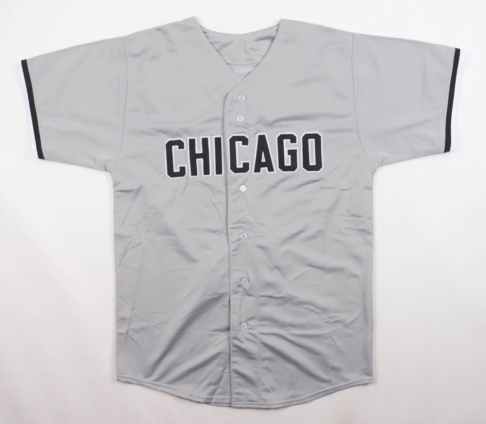 Custom jersey. Everything sewn on, size XL. Hand-signed by Frank Thomas (HOF). Frank Thomas's career stats have been stitched onto the reverse side of the jersey.