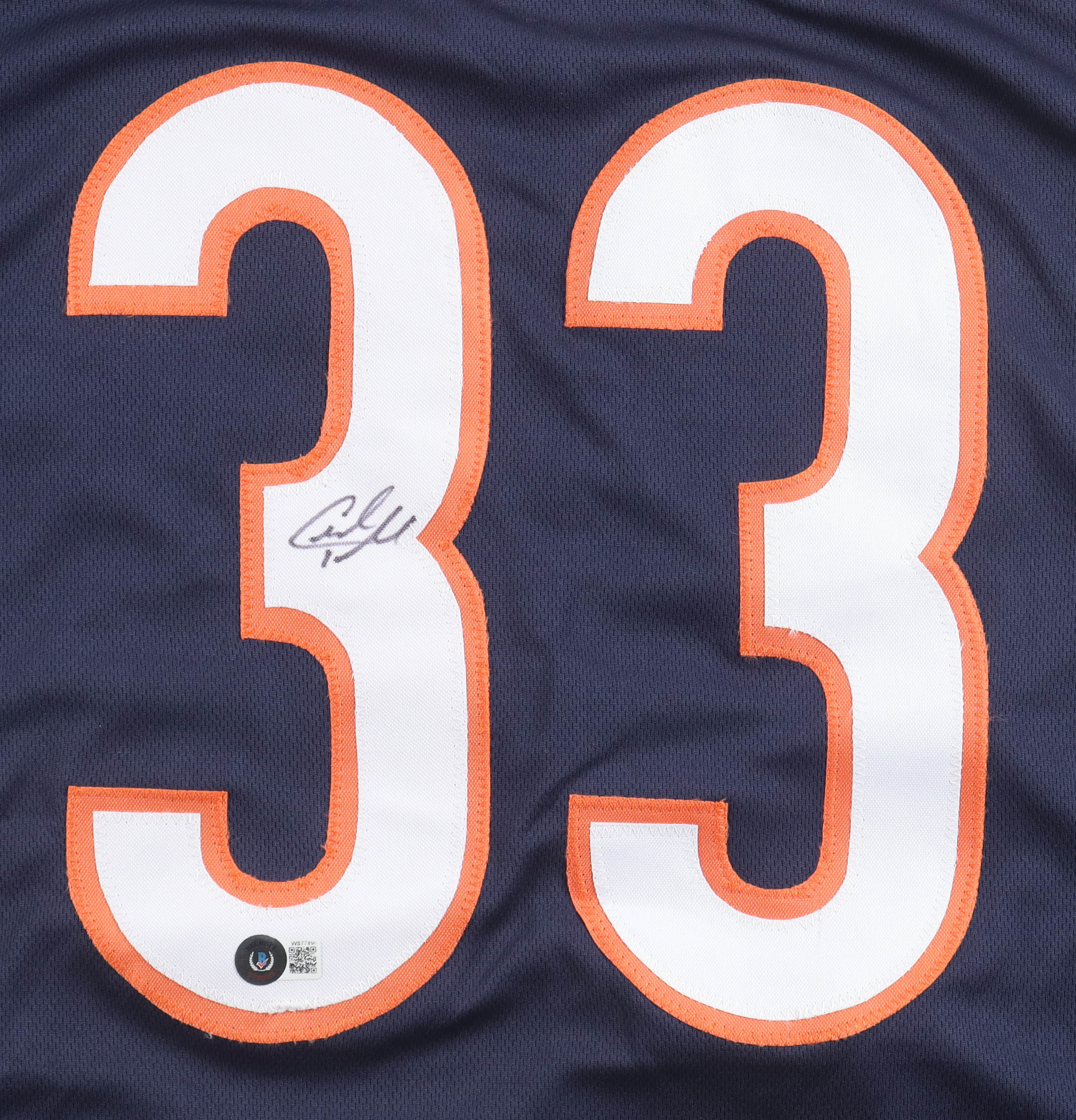 Custom jersey with everything sewn on, size XL. Hand-signed by Charles Tillman.