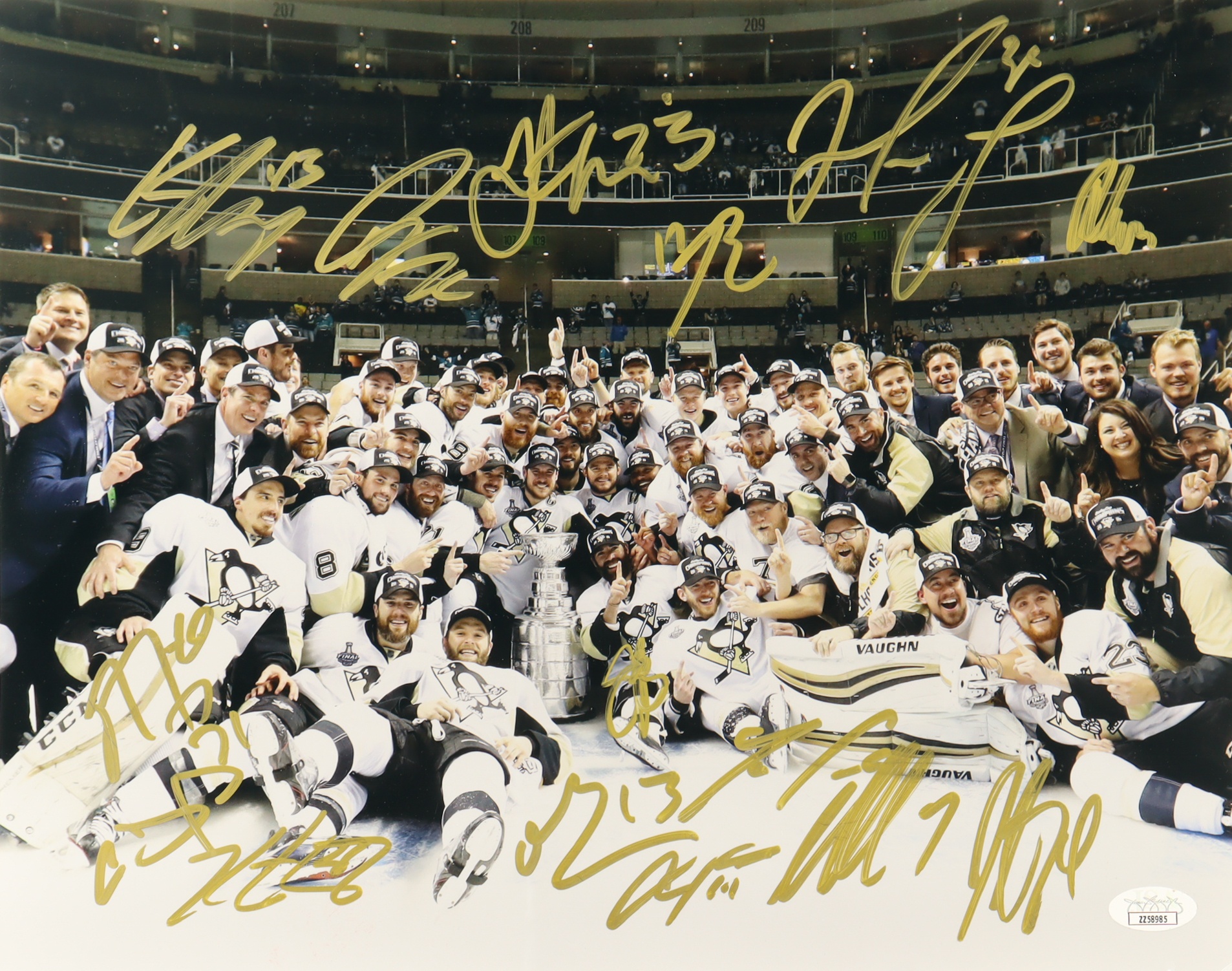 Photo measures approximately 11" x 14" in size and has been hand-signed by Sidney Crosby, Marc-Andre Fleury, Kris Letang, Evgeni Malkin, Phil Kessel, Bryan Rust, Matt Murray, Conor Sheary, Matt Cullen, Chris Kunitz, Nick Bonino, Trevor Daley, Patric Hornqvist, Justin Schultz, and Scott Wilson.