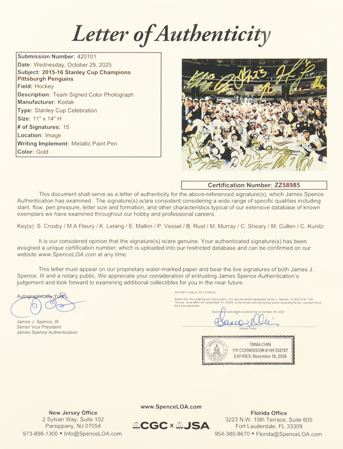 Penguins 2016 Stanley Cup Champions 11x14 Photo Team-Signed By (15) with Sidney Crosby, Marc-Andre Fleury, Kris Letang, Evgeni Malkin (JSA)