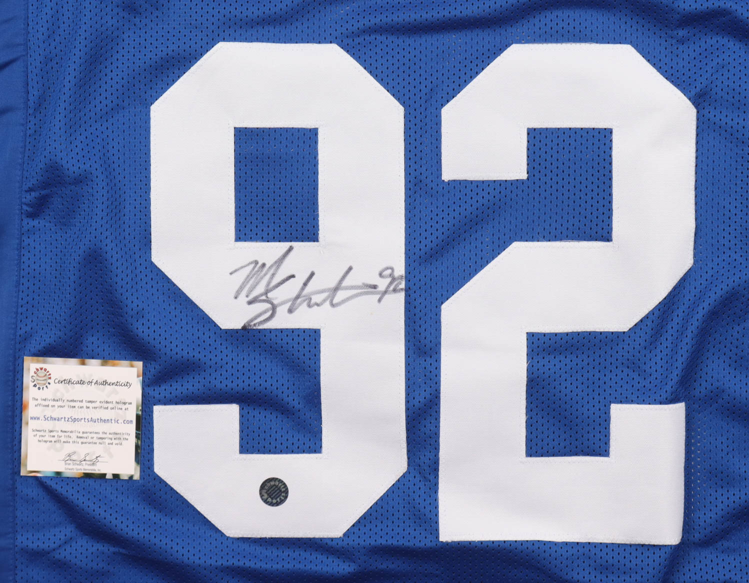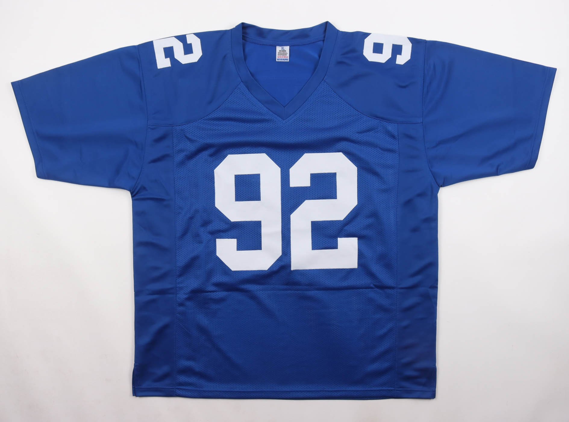 Custom jersey with everything sewn on, size XL. Hand-signed by Michael Strahan (HOF).