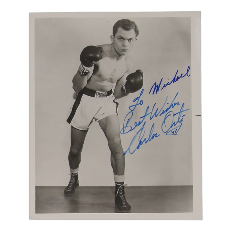 Photo measures approximately 8" x 10" in size and has been hand-signed and inscribed by Carlos Ortiz (D. 2022, HOF). Please note, the inscription has been personalized "To Michael".
