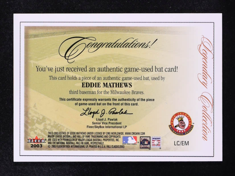 Eddie Mathews 2003 Fleer Fall Classics Legendary Collection Memorabilia Bat SP #EM