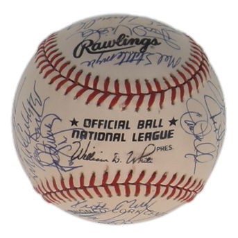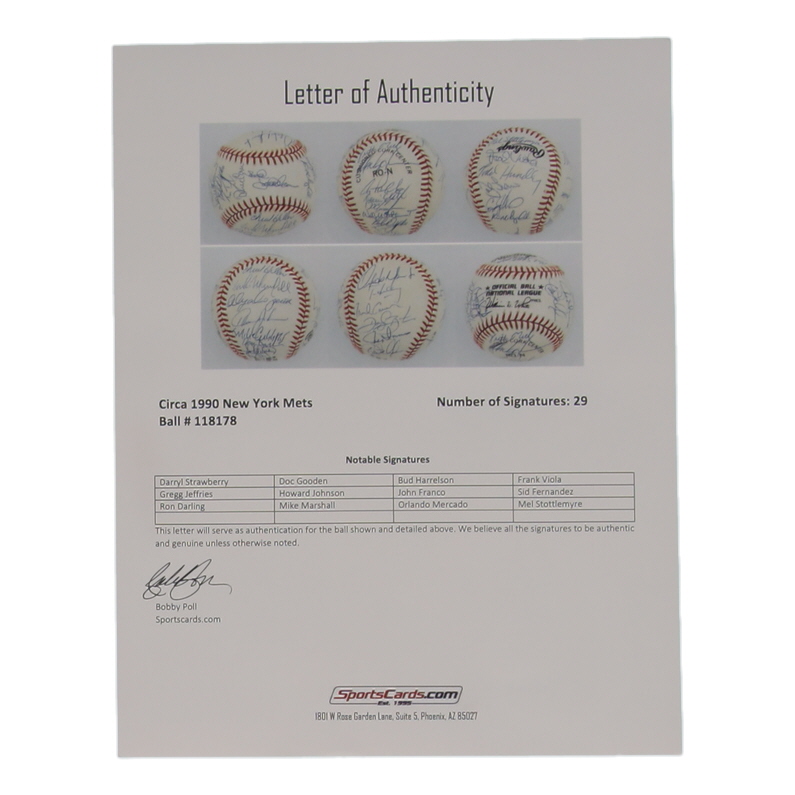 Rawlings Official National League Baseball has been hand-signed by (29) members of the 1980 New York Mets with Darryl Strawberry, Doc Gooden, Bud Harrelson, Frank Viola, Gregg Jeffries, Howard Johnson, John Franco, Sid Fernandez, Ron Darling, Mike Marshall, Orlando Mercado, Mel Stottlemyre, David Cone
