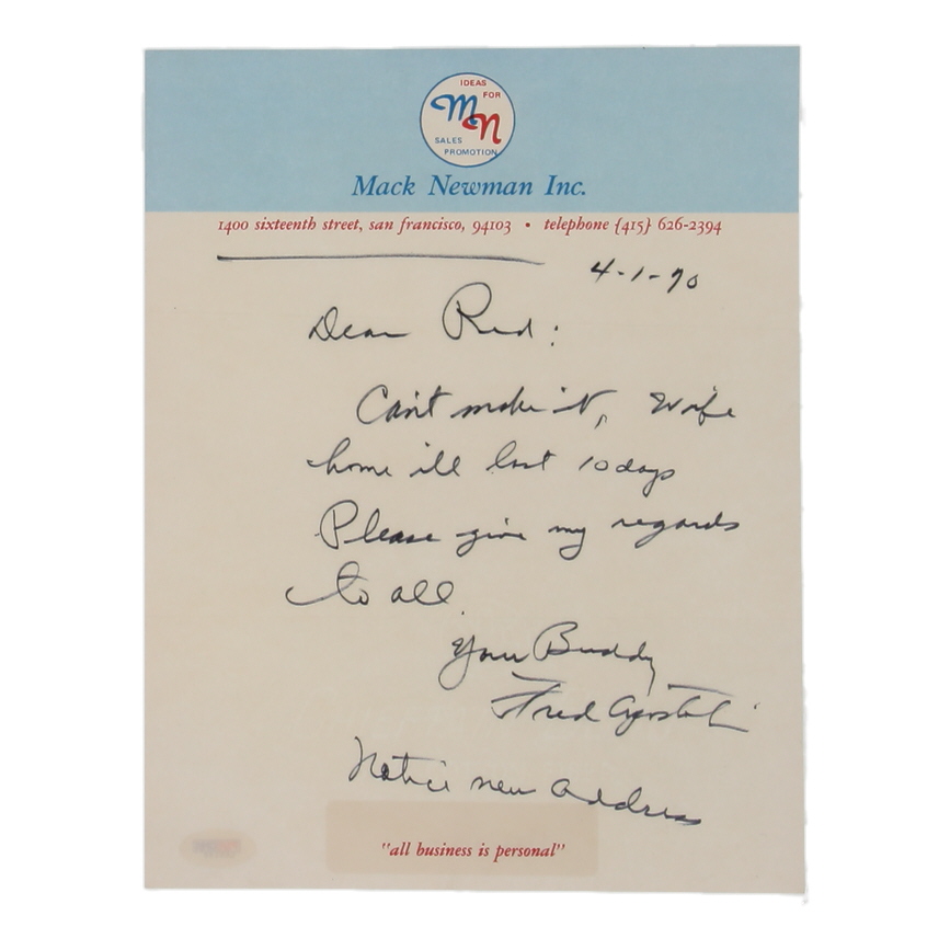 Letter measures approximately 8.5" x 11" in size and has been hand-signed and written by Fred Apostoli (D. 1973, HOF). Please note, the letter is laminated.