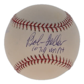 Rawlings Official Major League Baseball. Hand-signed and inscribed by Bob Feller (D. 2010, Cleveland Indians, HOF). Please note, ball has been stained and naturally tone. Refer to photos for more details.