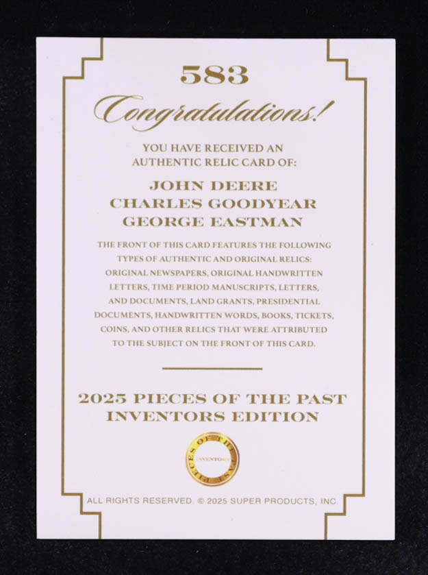 John Deere / Charles Goodyear / George Eastman 2025 Pieces of the Past Inventors Triple Relic #583
