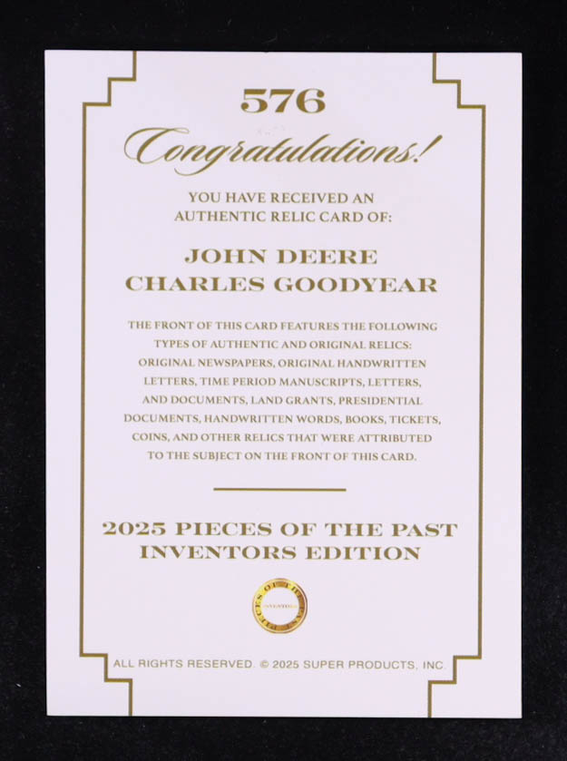 John Deere / Charles Goodyear 2025 Pieces of the Past Inventors Dual Hand Written Relic #576