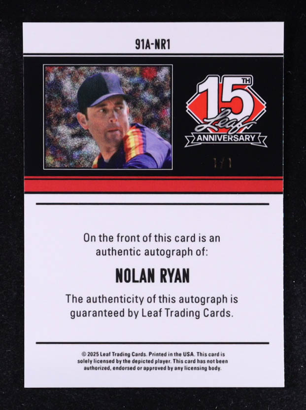 Nolan Ryan 2025 Leaf 15th Anniversary '91 Leaf Autographs Shimmer Pink #91ANR1 #1/1