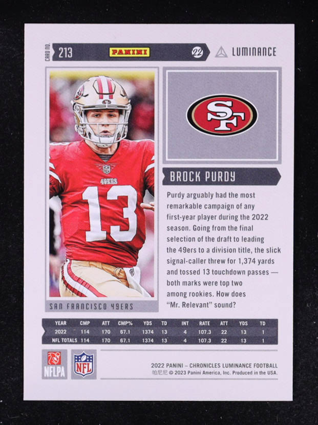 Brock Purdy 2022 Panini Chronicles Luminance Update Vertical Rookies #213 RC