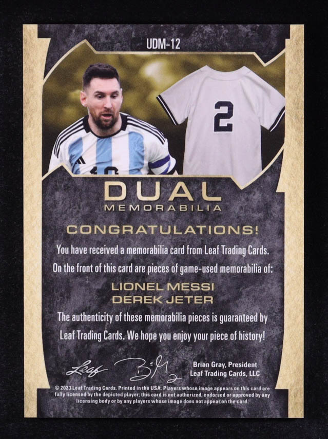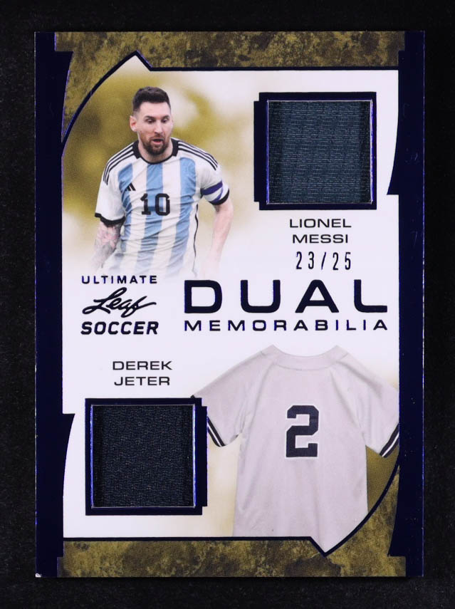Lionel Messi / Derek Jeter 2023 Leaf Ultimate Soccer Dual Memorabilia Spectrum Blue #UDM12 #23/25