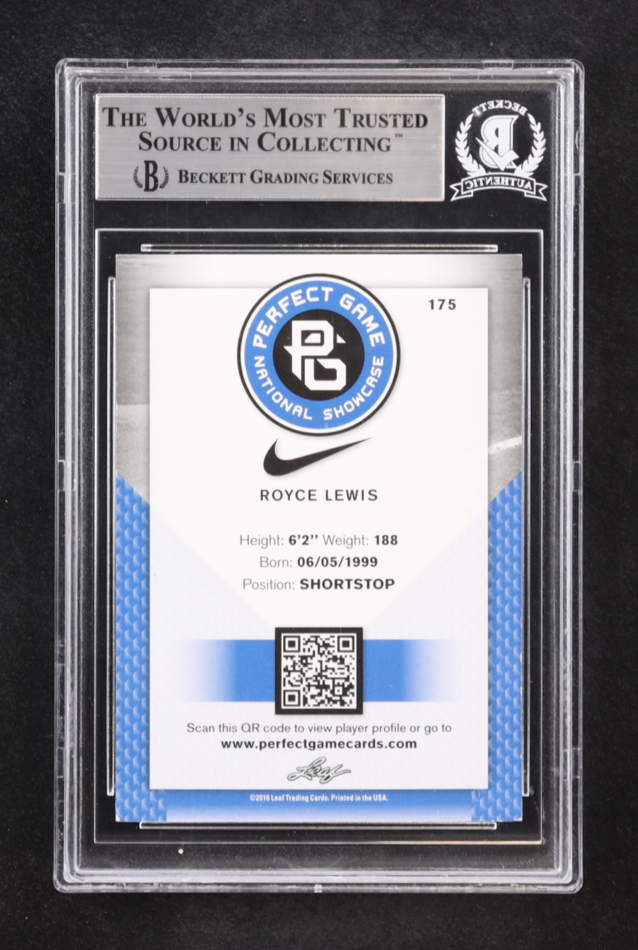 Royce Lewis Signed 2016 Leaf Perfect Game National Showcase #175 (BGS)