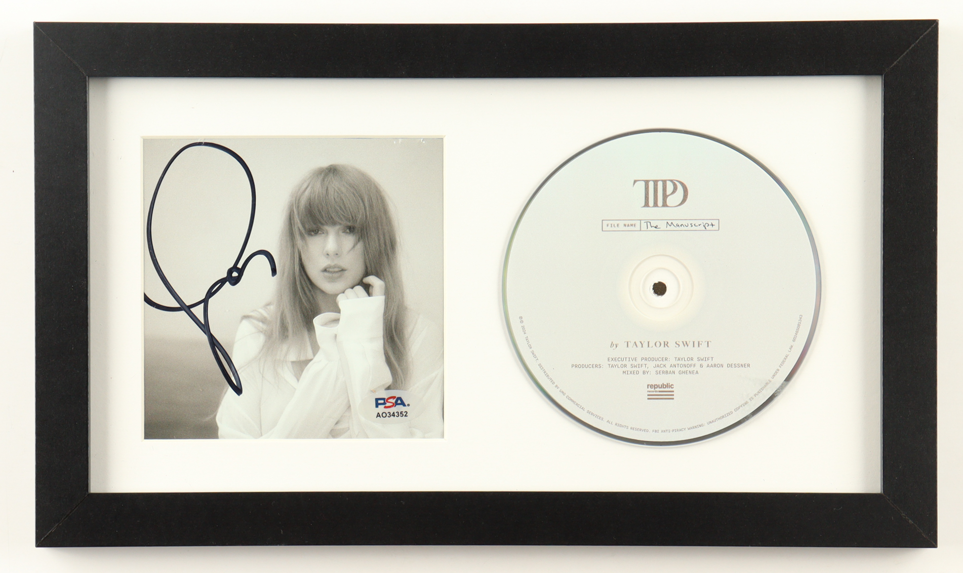Custom frame measures 8" x 13" in size. "The Tortured Poets Department" CD album slipcover has been hand-signed by Taylor Swift. Display also includes the CD.