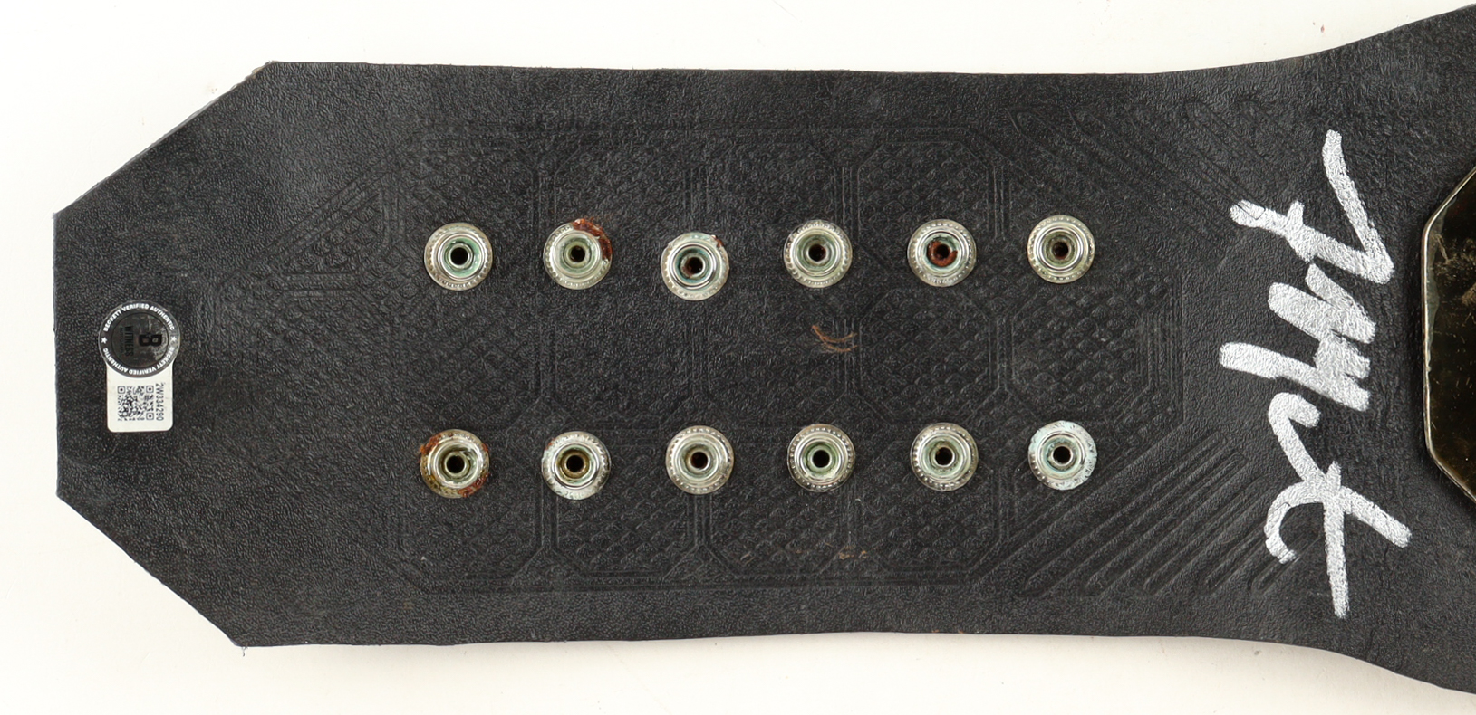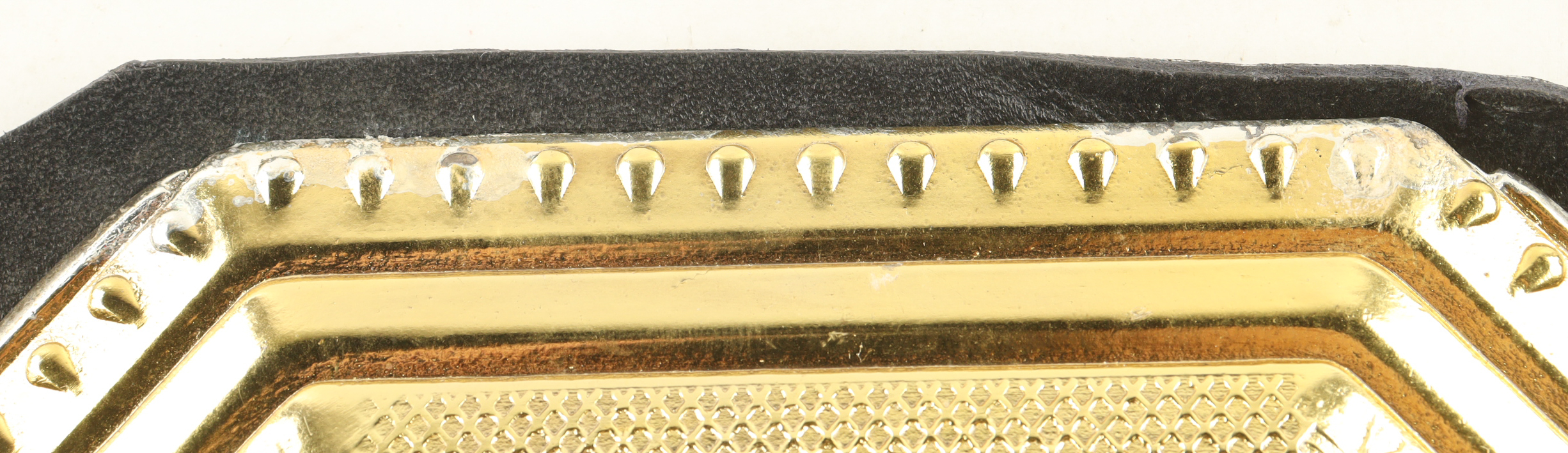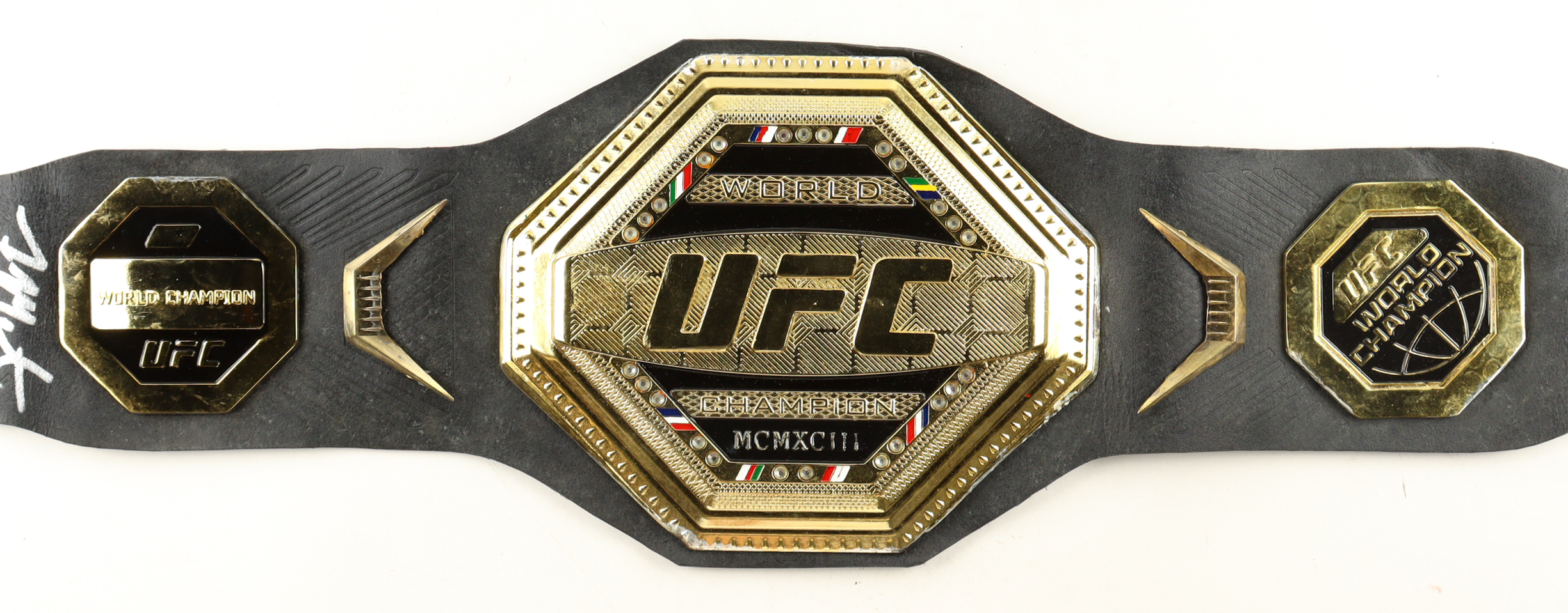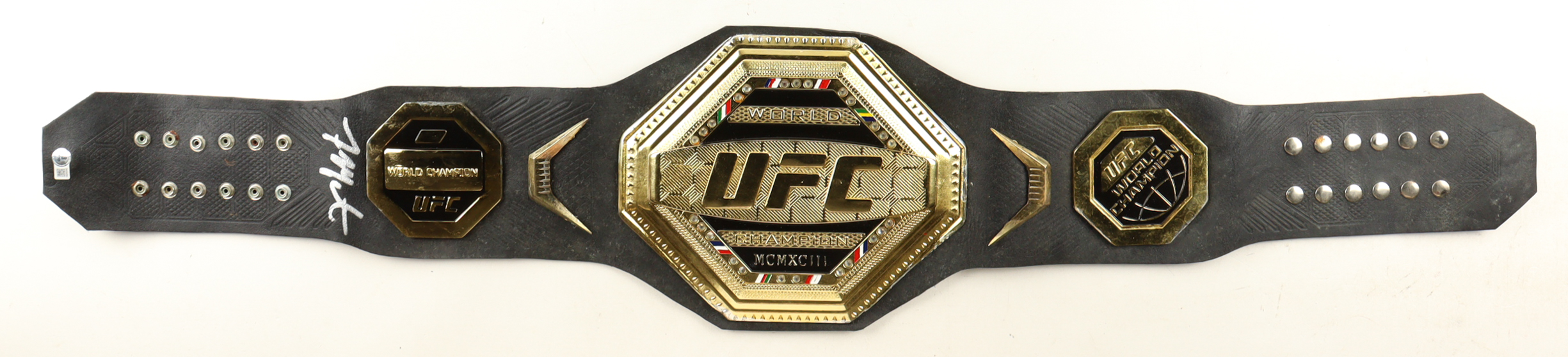 This full-size high-quality replica belt is faux leather and features metal plates. Hand-signed by Aljamain Sterling.