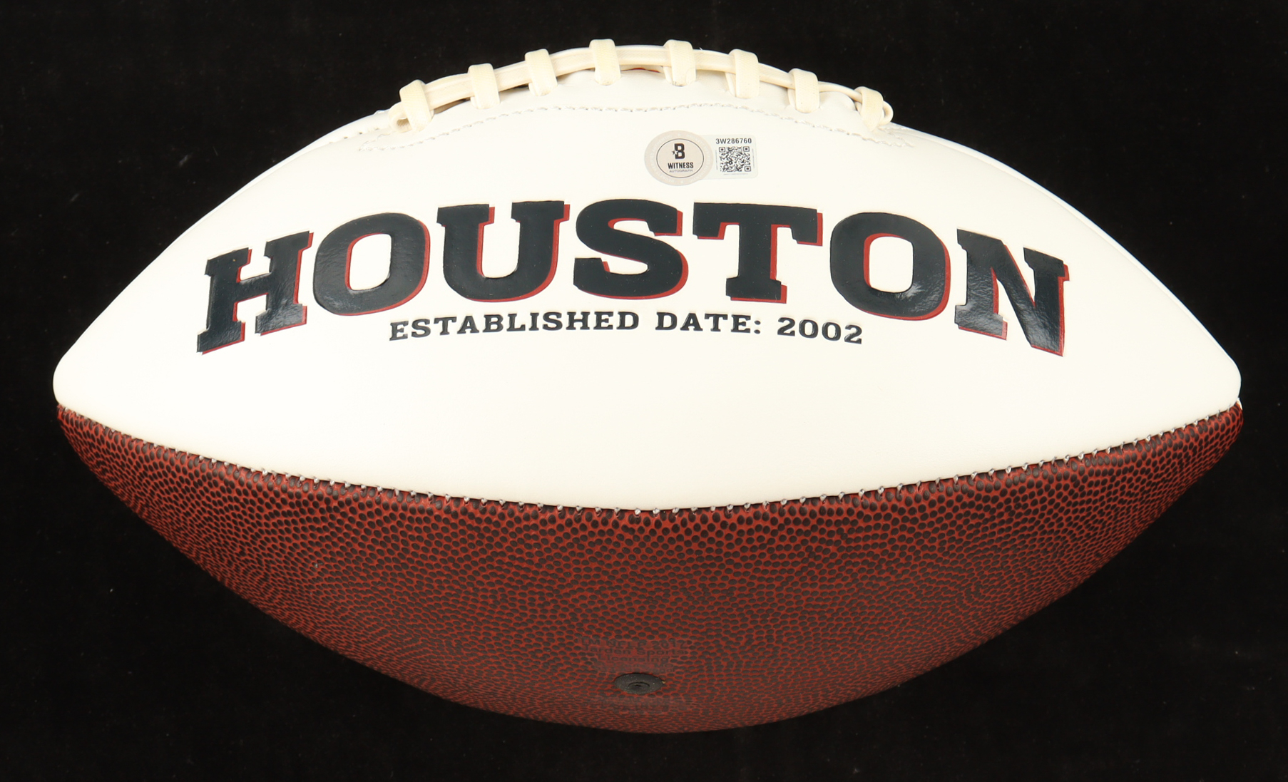 Houston Texans logo football has been hand-signed by Jayden Higgins.