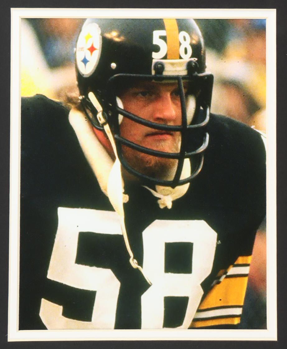 Custom frame measures 35" x 43” in size and features a jersey that has been hand-signed and inscribed by Jack Lambert (HOF).