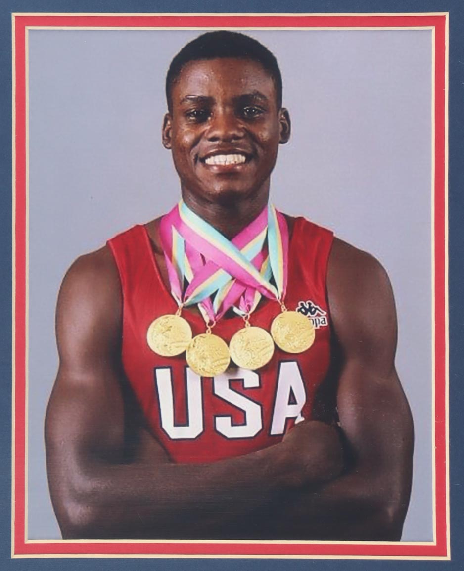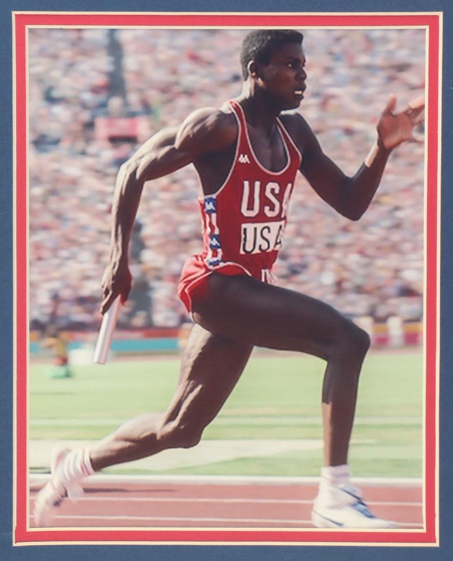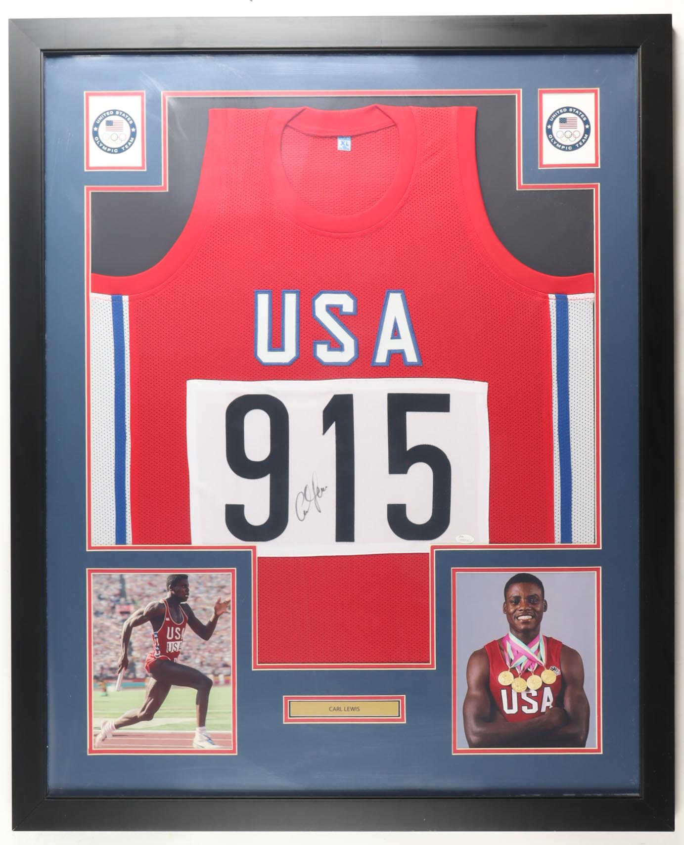 Custom frame measures 35" x 43" and has a Custom jersey with everything sewn on, size XL. Hand-signed by Carl Lewis (Team USA, HOF).