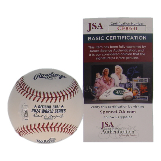Rawlings Official 2024 World Series Baseball. Hand-signed by Dino Ebel (Los Angeles Dodgers). Please note, there are minor stains throughout the baseball.