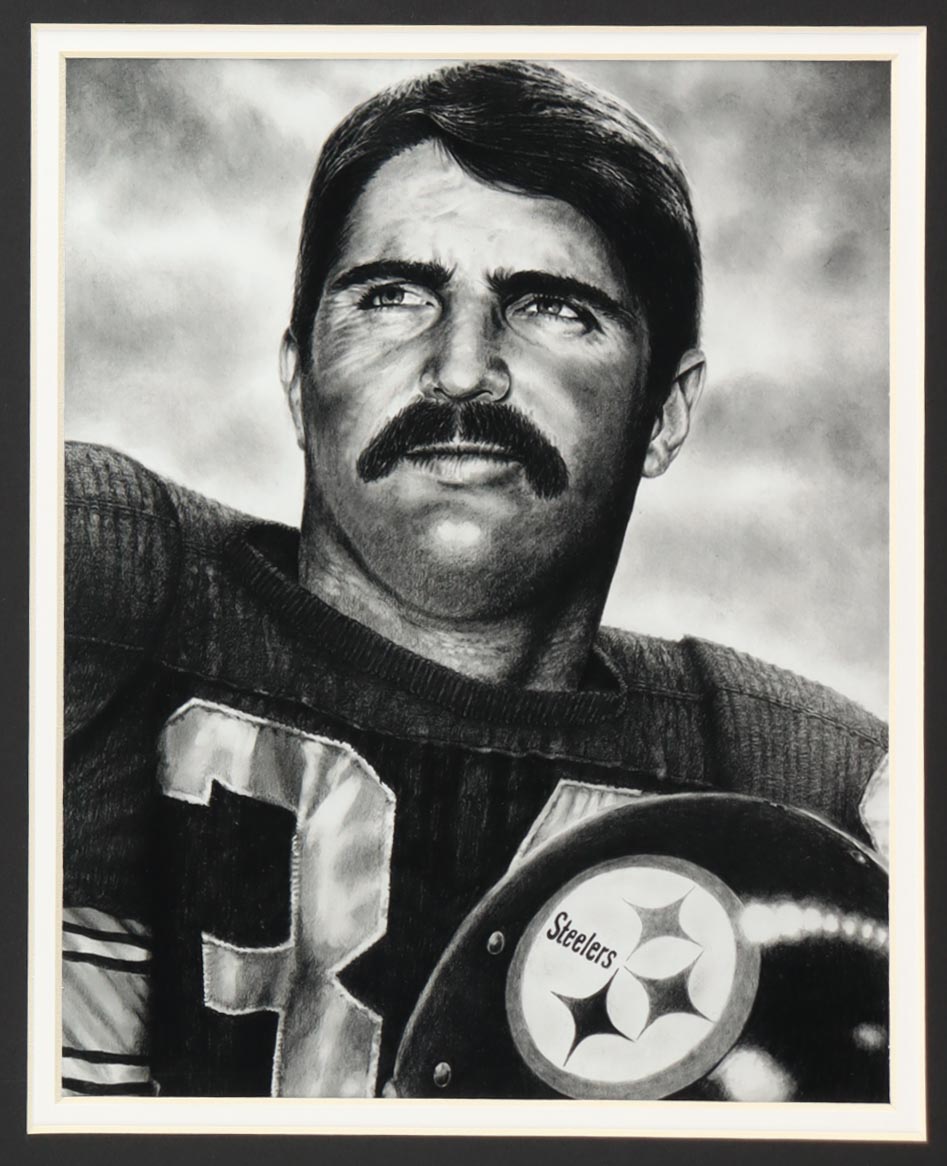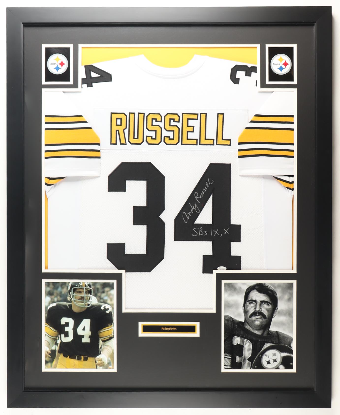 Custom frame measures 35" x 43" in size and features a jersey that has been hand signed and inscribed by Andy Russell (D. 2024).