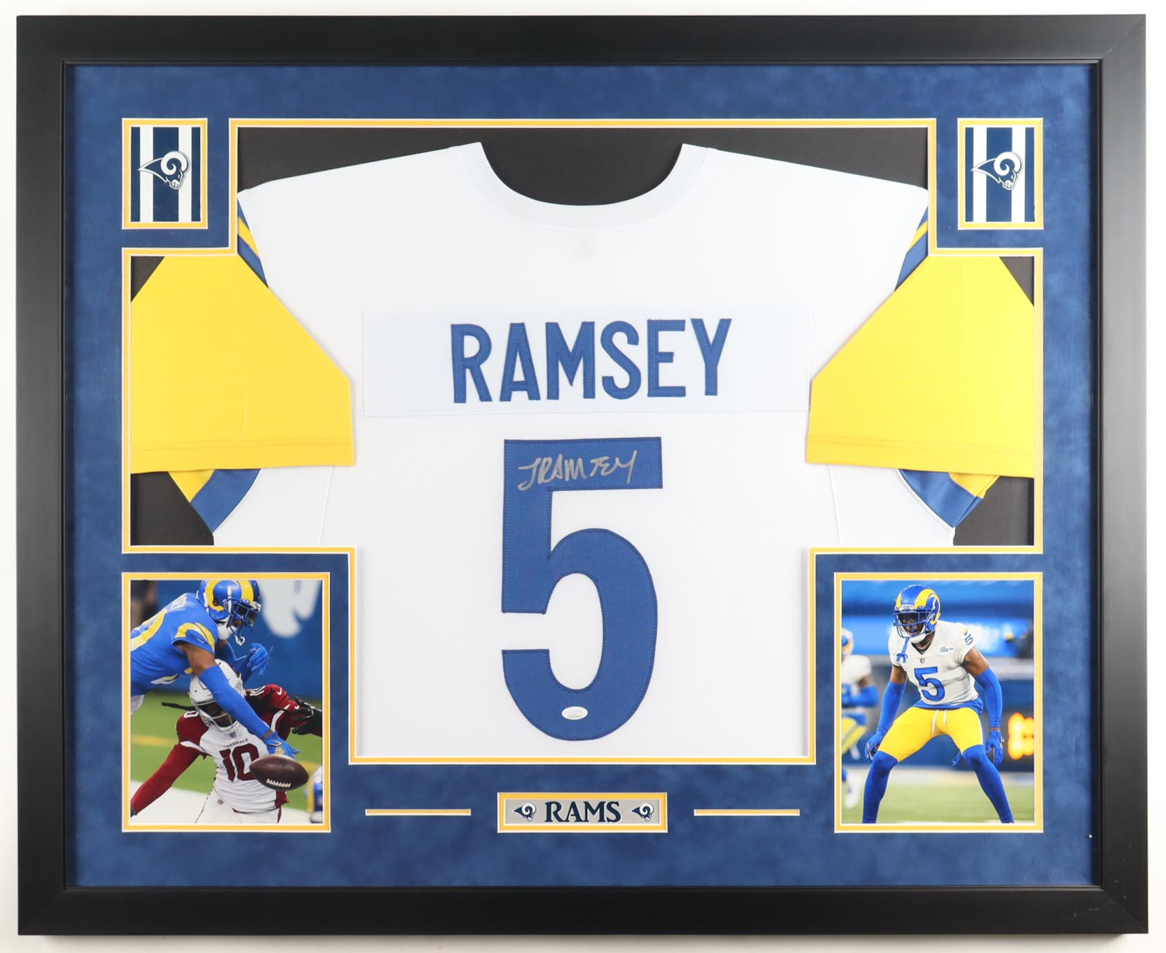 Custom frame measures approximately 35" x 43" in size and features a jersey that has been hand-signed by Jalen Ramsey.
