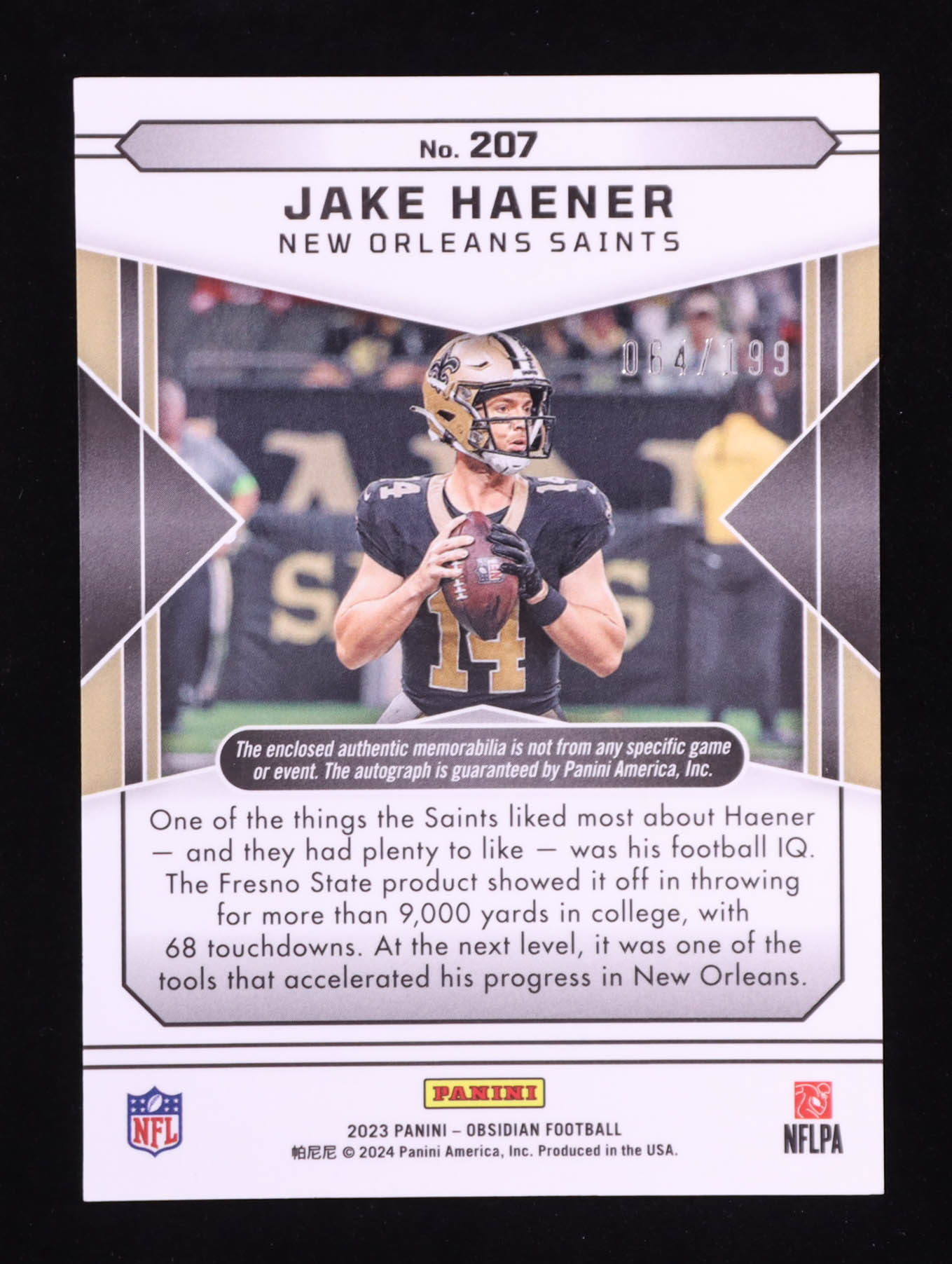 Jake Haener 2023 Panini Obsidian Auto #207 RC #064/199