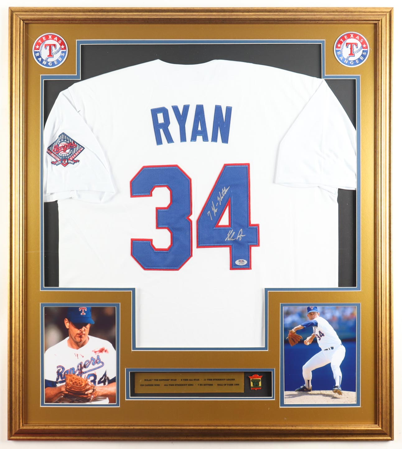 Nolan Ryan Signed Custom Framed Jersey Display Inscribed "7 No-Hitters" with Jersey Pin (PSA)