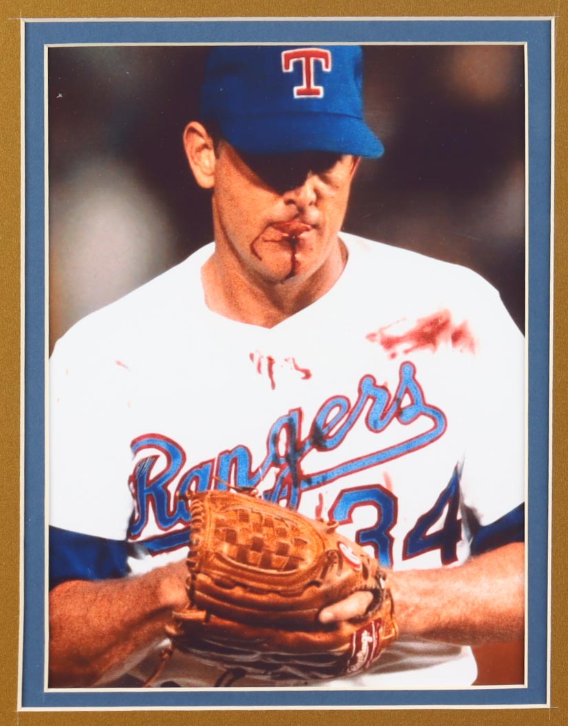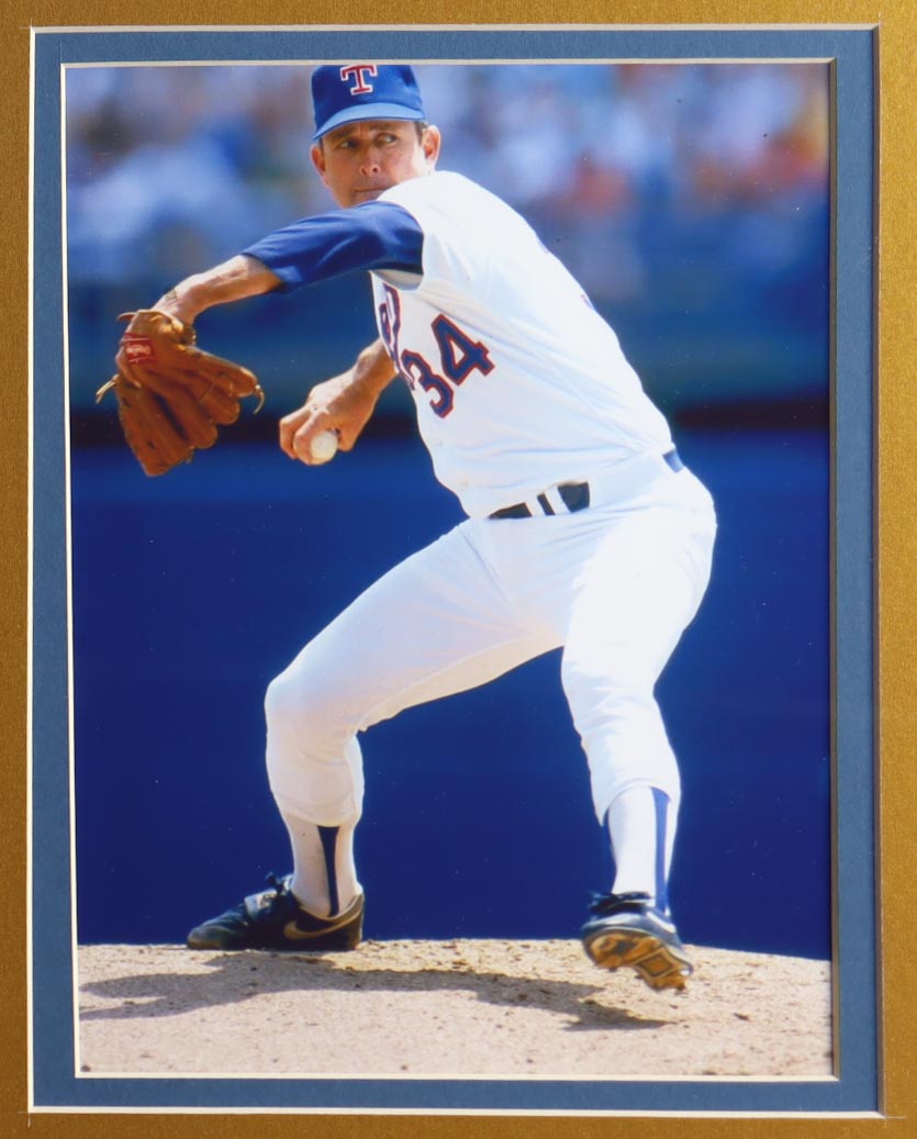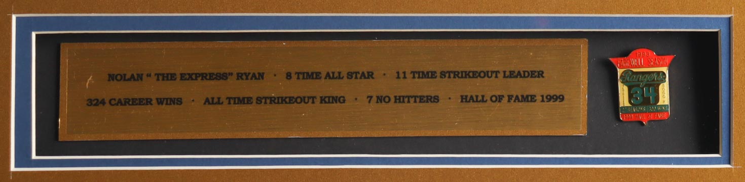 Custom frame display measures approximately 32" x 36" in size and features a jersey that has been hand-signed and inscribed by Nolan Ryan (Texas Rangers, HOF). The display also includes a jersey pin, (2) photos and (2) cloth team logo patches and a career statistics plaque.