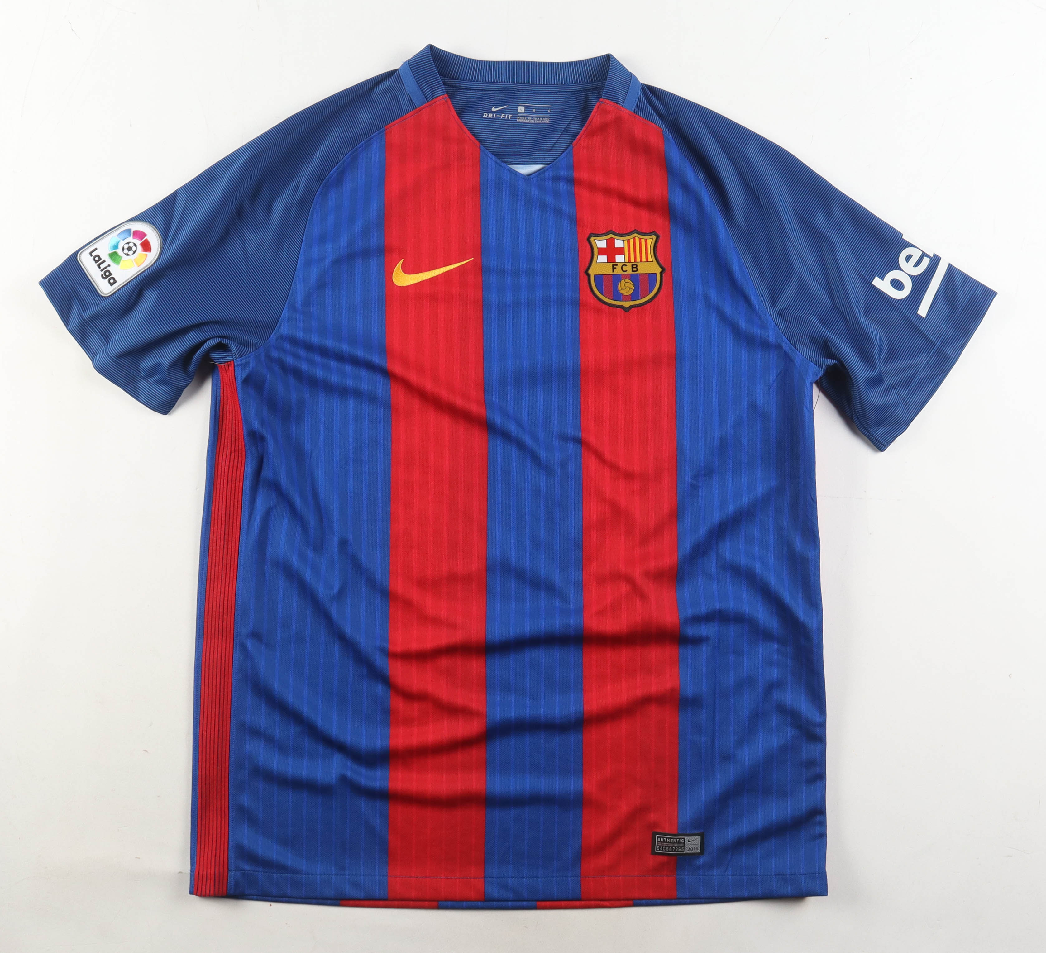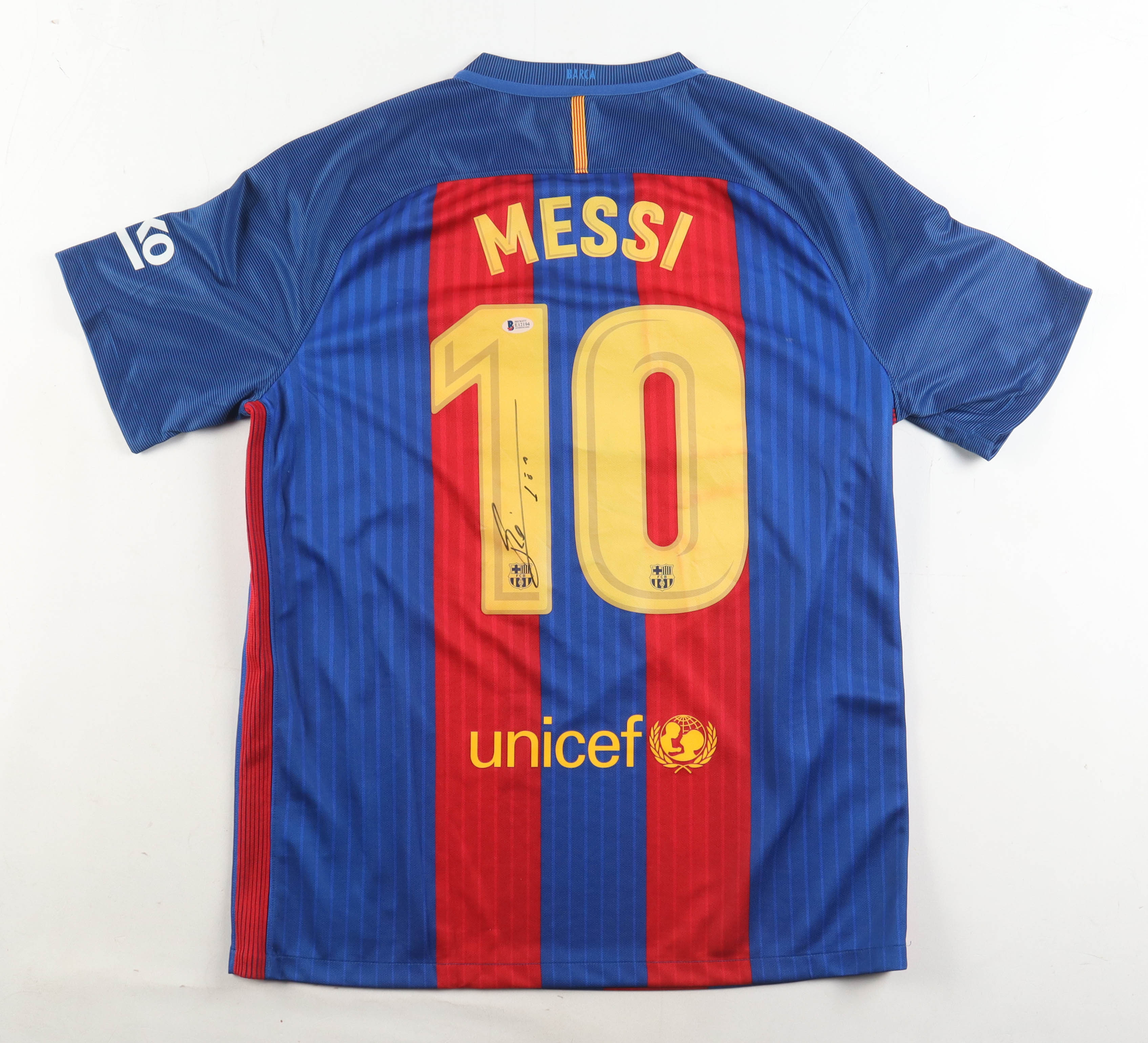 Nike jersey with everything pressed on, size L. Hand-signed by Lionel Messi. Please note, there is red staining on the reverse number. See photos regarding the condition of the item.